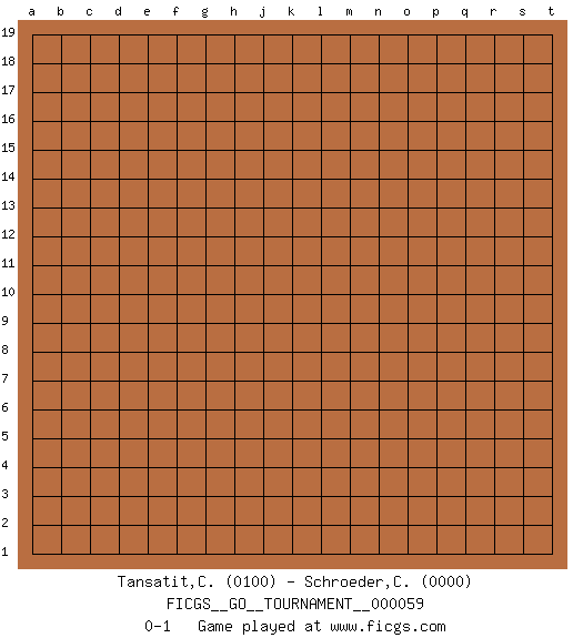 Last move : 0-1 2020 March 2 5:57:27 [Event "FICGS__GO__TOURNAMENT__000059"] [Site "FICGS"] [Date "2020.02.01"] [Round "1"] [Black "Tansatit,Chulaphun"] [White "Schroeder,Christoph"] [Result "0-1"] [Rating 1 "0100"] [Rating 2 "0000"] 0-1 This go game has been lost on time (started : 2020.02.01 0:37:32) Here are the names of the openings (joseki) played in the four corners : Player White won this Go (weiqi, baduk) game. Follow this game move after move (download)Error is one of the sources of transformation. (Pierre Audouard) Those who make the worst use of their time are the first to complain of its brevity. (Jean de la Bruyere)