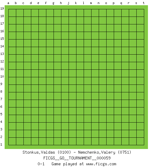Last move : 0-1 2020 March 2 5:57:27 [Event "FICGS__GO__TOURNAMENT__000059"] [Site "FICGS"] [Date "2020.02.01"] [Round "1"] [Black "Stonkus,Valdas"] [White "Nemchenko,Valery"] [Result "0-1"] [Rating 1 "0100"] [Rating 2 "0751"] 0-1 This go game has been lost on time (started : 2020.02.01 0:37:32) Here are the names of the openings (joseki) played in the four corners : Player White won this Go (weiqi, baduk) game. Follow this game move after move (download)Strike at the waist of the knight's move. (Anonymous) Luck never made a man wise. (Seneca, Letters to Lucilius)
