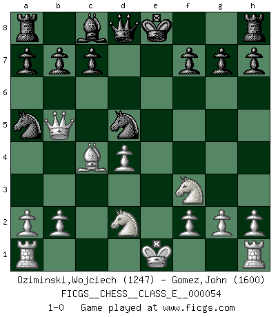 Last move : 1-0 2007 November 18 19:24:50 [Event "FICGS__CHESS__CLASS_E__000054"] [Site "FICGS"] [Date "2007.07.05"] [Round "1"] [White "Oziminski,Wojciech"] [Black "Gomez,John"] [Result "1-0"] [WhiteElo "1247"] [BlackElo "1600"] 1.e4 Nc6 2.Nf3 e5 3.d4 exd4 4.Bc4 Bc5 5.c3 Nf6 6.cxd4 Bb4+ 7.Bd2 Bxd2+ 8.Nbxd2 d5 9.exd5 Nxd5 10.Qb3 Na5 11.Qb5+ 1-0 This chess game has been lost on time (started : 2007.07.05 20:7:2) KP : Nimzovich defense Player White won this chess game. Follow this game move after move (download)An attack on the wing should be met by play in the center. (Nimzovitch) Sie bekommen vielleicht den Eindruck, dass die Spitzenspieler überhaupt gar nicht so stark sind. Aber das stimmt nicht. Es ist eine Illusion. Mit einem Computer an der Seite ist es sehr leicht, Urteile zu fällen, aber wenn man alleine am Brett sitzt, sieht die Sache ganz anders aus. (Vladimir Kramnik) Puntos débiles o agujeros en la posición de tu oponente deben de ser ocupados por piezas, no Peones. (Siegbert Tarrasch) Vouloir jouer aux échecs contre soi-même est aussi paradoxal que vouloir marcher sur son ombre. (Stefan Zweig) Just because you do not take an interest in politics doesn't mean politics won't take an interest in you. (Pericles 430 B.C.)