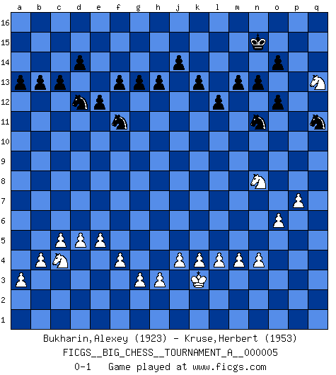 Last move : 0-1 2020 August 11 11:48:40 [Event "FICGS__BIG_CHESS__TOURNAMENT_A__000005"] [Site "FICGS"] [Date "2020.02.05"] [Round "1"] [White "Bukharin,Alexey"] [Black "Kruse,Herbert"] [Result "0-1"] [WhiteElo "1923"] [BlackElo "1953"] 1.j2-k4 p16-o14 2.m2-m4 j15-k13 3.h1-o7 h15-g13 4.h2-g4 b16-c14 5.e2-e4 e15-e13 6.p1-o3 f16-b12 7.d2-d4 m15-m13 8.g1-f3 l16-p12 9.b1-c3 h16-l13 10.k1-l3 d15-d14 11.n2-n4 c16-l8 12.o7-d7 l8-h11 13.d7-b9 k16-h15 14.o1-b13 a15-a13 15.f1-b5 h11-b5 16.b9-b5 n15-n14 17.c1-g5 l13-b4 18.b5-b4 o16-b4 19.a2-a3 b4-f8 20.l1-m2 e13-e12 21.l3-m5 e16-e13 22.b13-a12 b15-b13 23.a12-j4 g13-f11 24.k4-l6 e13-j13 25.m2-f8 b12-f8 26.k2-k3 m16-m14 27.j1-k2 m14-l14 28.o3-n5 g16-f14 29.c3-d5 j16-j15 30.e1-e3 c14-d12 31.m1-m3 q16-e16 32.m3-p3 q15-q13 33.q2-q4 e16-e13 34.e3-c3 e13-c13 35.c3-c13 j13-c13 36.d5-e3 a16-e16 37.q4-q5 e16-e13 38.c2-c4 e13-j13 39.b2-b4 f14-g12 40.c4-c5 l14-l10 41.q5-q6 h15-k14 42.q6-q7 k14-l12 43.q7-q8 p15-p14 44.p3-o3 p12-o13 45.j4-g6 l10-q10 46.g6-o13 p14-o13 47.l2-l4 j13-j8 48.n5-p6 o14-p12 49.m5-n7 c13-c10 50.k3-k4 c10-o10 51.o3-o10 q10-o10 52.o2-o4 f8-l13 53.o4-o5 o10-e10 54.e4-e5 l13-n11 55.g5-n11 p12-n11 56.q1-q7 g12-j11 57.q7-p7 e10-p10 58.p7-p10 n11-p10 59.q8-q9 p10-o8 60.p6-o8 j8-o8 61.a1-q1 o8-a8 62.e3-c4 l12-n11 63.p2-p4 k13-m12 64.p4-p5 m12-n10 65.d4-d5 l15-l14 66.f3-h4 j11-l10 67.h4-k5 a8-a9 68.k5-l7 l10-m8 69.l6-m8 n10-m8 70.f2-f4 m8-o9 71.n7-p6 f15-f13 72.l7-n6 g15-g13 73.k2-k3 l14-l13 74.g2-g3 k15-k13 75.j3-j4 j15-k14 76.q1-q7 c15-c13 77.p6-o8 h14-h13 78.p5-p6 l13-l12 79.n6-p7 o9-m10 80.o8-p10 n11-p12 81.q9-q10 a9-p9 82.p10-o12 p12-o14 83.g4-h6 n14-n13 84.o12-q11 p9-p10 85.h6-j8 m10-o11 86.p7-o9 o14-p12 87.o9-p11 o13-o12 88.p11-q13 p12-q10 89.j8-l7 k14-l13 90.l7-n6 l13-m14 91.q7-p7 p10-p7 92.n6-p7 q10-p12 93.q13-p15 p12-n11 94.p7-n8 m14-n15 95.o5-o6 o15-o14 96.p6-p7 o11-p13 97.p15-q13 p13-q11 0-1 Follow this game move after move (download)For surely of all the drugs in the world, Chess must be the most permanently pleasurable. (Assiac) Die westlichen Werte sind eine Sprache, welche die Putin-Administration nicht versteht. (Garry Kasparov) En el Ajedrez, tal como en la vida, las bendiciones de hoy pueden ser el veneno del mañana. (Assaic) Mais n'est-ce pas déjà le limiter injurieusement que d'appeler les échecs un jeu? N'est-ce pas aussi une science, un art, ou quelque chose qui, comme le cercueil de Mahomet entre ciel et terre, est suspendu entre l'un et l'autre, et qui réunit un nombre incroyable de contraires ? (Stefan Zweig) Computers have lots of memory but no imagination. (Anonymous)