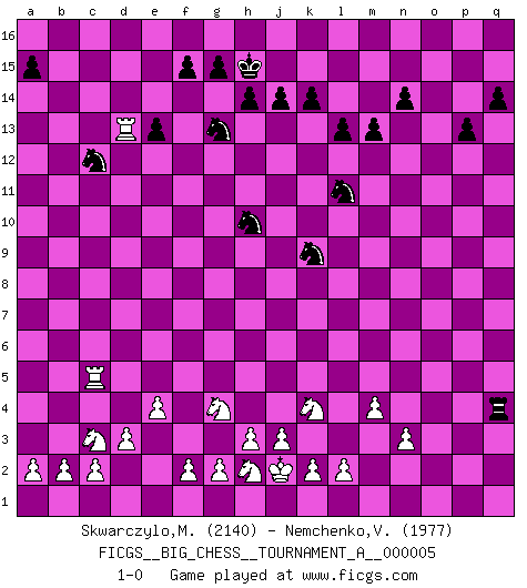 Last move : 1-0 2020 April 8 15:1:28 [Event "FICGS__BIG_CHESS__TOURNAMENT_A__000005"] [Site "FICGS"] [Date "2020.02.05"] [Round "1"] [White "Skwarczylo,Marek"] [Black "Nemchenko,Valery"] [Result "1-0"] [WhiteElo "2140"] [BlackElo "1977"] 1.j2-k4 j15-k13 2.h1-o7 h15-g13 3.o7-o15 p16-o14 4.o15-f7 g16-f14 5.p1-o3 n15-n14 6.f7-c10 h16-h15 7.c10-c15 h15-f13 8.h2-g4 b16-c14 9.c15-l7 d15-d14 10.b1-c3 m15-m13 11.m2-m4 l16-m15 12.l1-o4 k16-h15 13.n2-n3 e15-e13 14.e2-e4 f16-e15 15.f1-c4 o16-j11 16.d2-d3 j16-j15 17.c1-l9 f14-h13 18.k1-h2 o14-n12 19.o1-g8 m16-o16 20.l9-j11 h13-j11 21.g1-j2 c16-e14 22.g8-j10 f13-g14 23.j10-e14 g14-e14 24.e1-e3 o16-o10 25.l7-p7 p15-p13 26.p7-q8 l15-l13 27.a1-e1 k15-k14 28.e3-f3 e16-o16 29.o4-j9 k13-l11 30.m1-m3 o10-o8 31.q8-q5 m15-g10 32.m3-l3 j11-k9 33.f3-f10 g10-o3 34.p2-o3 o8-o3 35.k4-m3 o3-o5 36.q5-q10 a16-l16 37.c4-j10 l11-j10 38.j9-q16 o16-q16 39.q10-j10 e14-j10 40.f10-j10 n12-l11 41.j10-p10 q15-q14 42.j2-k4 l16-o16 43.j1-j2 g13-j12 44.e1-p1 e15-q4 45.p1-p4 q4-o2 46.m3-o2 o5-o2 47.p4-n4 o16-o14 48.p10-b10 c14-a13 49.b10-a10 a13-c14 50.a10-d10 c14-d12 51.d10-b10 q16-b16 52.q2-q4 h15-g13 53.q1-p1 j12-h10 54.p1-p5 o2-q2 55.p5-a5 d12-c14 56.a5-b5 c14-a13 57.b10-b13 a13-c12 58.b13-b15 b16-a16 59.b15-b16 a16-b16 60.b5-b16 j15-h15 61.b16-c16 o14-o12 62.l3-l5 o12-q12 63.l5-c5 d14-d13 64.c16-c13 q12-q4 65.n4-q4 q2-q4 66.c13-d13 1-0 Follow this game move after move (download)Checkers is for tramps. (Paul Morphy) Capablanka war das größte Genie der Schachgeschichte! Aber denken sie nicht er habe nichts vom Schach verstanden. Er wusste nur soviel wie er wissen musste um seine Ziele zu erreichen. (Mikhail Moiseyevich Botvinik) Del Ajedrez se ha dicho que la vida no es lo suficientemente larga para él, pero eso es culpa de la vida, no del Ajedrez. (William Ewart Napier) L'ordinateur a tué l'originalité. Il n'y a plus guère d'aventures sur l'échiquier. (Jacob Murray) If everyone is thinking alike, then somebody isn't thinking. (US General George S. Patton)