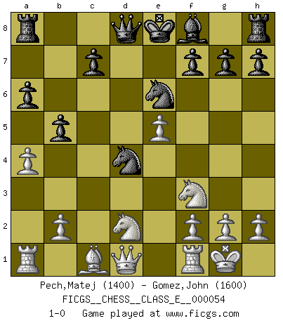 Last move : 1-0 2007 November 5 6:35:32 [Event "FICGS__CHESS__CLASS_E__000054"] [Site "FICGS"] [Date "2007.07.05"] [Round "1"] [White "Pech,Matej"] [Black "Gomez,John"] [Result "1-0"] [WhiteElo "1400"] [BlackElo "1600"] 1.e4 e5 2.Nf3 Nc6 3.Bb5 a6 4.Ba4 Nf6 5.O-O Nxe4 6.d4 b5 7.Bb3 d5 8.dxe5 Be6 9.Nbd2 Nc5 10.c3 d4 11.Bxe6 Nxe6 12.cxd4 Ncxd4 13.a4 1-0 This chess game has been lost on time (started : 2007.07.05 20:7:2) Ruy Lopez : Open, 7.Bb3 Kingside Castling by player White (move 5) Player White won this chess game. Follow this game move after move (download)The sign of a great Master is his ability to win a won game quickly and painlessly. (Irving Chernev) Modernes Schach erfordert enorme Anspannung. Es ist für einen normalen Menschen unmöglich das auszuhalten. (Viktor Kortschnoi) La táctica fluye a partir de una posición superior. (Bobby Fischer) Toute estimation doit être constamment réévaluée. (Jacob Estrin) The modern world has divided itself into Conservatives and Progressives. The business of Progressives is to go on making mistakes. The business of the Conservatives is to prevent the mistakes from being corrected. (G.K. Chesterton)