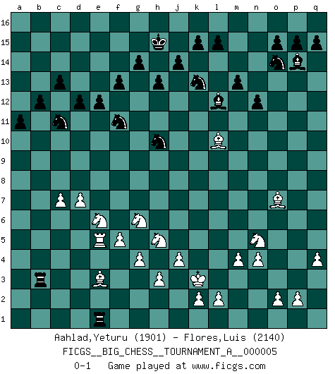 Last move : 0-1 2020 September 2 21:20:51 [Event "FICGS__BIG_CHESS__TOURNAMENT_A__000005"] [Site "FICGS"] [Date "2020.02.05"] [Round "1"] [White "Aahlad,Yeturu"] [Black "Flores,Luis"] [Result "0-1"] [WhiteElo "1901"] [BlackElo "2140"] 1.j2-k4 h15-g13 2.h1-o7 m15-m13 3.e2-e4 j15-k13 4.f1-b5 b16-c14 5.d2-d3 p16-o14 6.m2-m4 e15-e13 7.l1-p5 k16-h15 8.b1-c3 l16-p12 9.c1-o12 h16-l13 10.n2-n4 g16-j15 11.h2-g4 l13-b4 12.a1-b1 n15-n14 13.o1-c12 d15-d13 14.c12-f9 f16-c13 15.p1-o3 o16-g9 16.g1-j2 c16-l8 17.e1-e3 g9-h8 18.a2-a3 b4-c5 19.e4-e5 n14-n13 20.o12-g5 e16-e14 21.o7-e7 c5-c11 22.e7-b10 c11-b12 23.b10-b12 c14-b12 24.c3-d5 e14-b14 25.c2-c4 p12-o13 26.m1-m3 b12-c10 27.k4-j6 h8-j7 28.g5-j7 c13-j7 29.e3-f3 l8-k9 30.b1-d1 c10-d8 31.f9-g8 b14-f14 32.f3-f14 h15-f14 33.d3-d4 g13-f11 34.g8-h9 e13-e12 35.m3-l3 k9-c2 36.d1-a1 f14-g12 37.h9-j10 f15-f13 38.d5-f6 j15-l14 39.f6-h5 j7-n11 40.j6-g7 a16-e16 41.l3-l8 n11-k14 42.l8-p8 o13-p14 43.f2-f4 c2-m11 44.p8-p6 d8-e10 45.f4-f5 j16-h15 46.k1-l3 l14-k12 47.j10-g8 e10-c11 48.b5-j12 g15-g14 49.j12-n8 e16-e14 50.j1-h2 e14-b14 51.b2-b4 g12-h10 52.g8-l4 d13-d12 53.g4-f6 m11-l12 54.d4-d5 k12-j10 55.q1-e1 m16-e16 56.e1-e4 b14-b8 57.l4-o7 h14-h13 58.e4-l4 e16-e14 59.c4-c5 e14-a14 60.a3-a4 q16-e16 61.n8-l10 n13-n12 62.o3-n5 e16-e14 63.a4-a5 e14-b14 64.a1-b1 a14-a5 65.c5-c6 a5-b5 66.b1-a1 a15-a14 67.l3-k5 b5-b4 68.l4-l5 b4-b2 69.j2-h4 b2-e2 70.f6-d7 b8-b1 71.a1-a8 j10-g9 72.d5-d6 e2-e1 73.h2-j2 b1-a1 74.a8-o8 g9-f7 75.p6-e6 k14-p9 76.l5-l8 p9-o8 77.l8-o8 f7-g5 78.e6-g6 g5-f7 79.h4-f3 e1-e2 80.p5-l9 a1-a3 81.q2-q4 a3-f3 82.j2-k3 f3-b3 83.k5-h4 f7-e5 84.d7-e5 e2-e5 85.n5-l6 b14-b8 86.o8-b8 b3-b8 87.l9-f4 e5-e1 88.l6-n5 a14-a13 89.c6-c7 b8-b5 90.d6-d7 a13-a12 91.g6-a6 b15-b13 92.h4-g6 e1-b1 93.j3-j4 c15-c13 94.g2-g4 b5-b6 95.a6-a5 b13-b12 96.g7-e6 a12-a11 97.f4-e3 b6-b3 98.a5-e5 b1-e1 0-1 Follow this game move after move (download)Openings teach you openings. Endgames teach you chess ! (Stephan Gerzadowicz) Der zweitbeste Zug ist oft der einzig richtige. (Savielly Grigorievitsch Tartakower) La vida es como el Ajedrez, con lucha, competición y eventos buenos y malos. (Benjamin Franklin) Shah mat. Le roi est mort. Cri de fierté d'un joueur venant de terrasser son adversaire, courtoisement, sans effusion de sang. Logic : The art of thinking and reasoning in strict accordance with the limitations and incapacities of the human misunderstanding. (Ambrose Bierce)