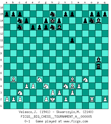 Last move : 0-1 2020 June 14 4:38:56 [Event "FICGS__BIG_CHESS__TOURNAMENT_A__000005"] [Site "FICGS"] [Date "2020.02.05"] [Round "1"] [White "Velasco,Jose Maria"] [Black "Skwarczylo,Marek"] [Result "0-1"] [WhiteElo "1941"] [BlackElo "2140"] 1.j2-k4 p16-o14 2.h1-o7 h15-g13 3.m2-m4 b16-c14 4.l1-p5 j15-h13 5.n2-n4 k16-h15 6.d2-d4 h16-m12 7.g1-f3 m12-n12 8.e2-e4 n12-n4 9.p1-o3 n4-e12 10.o7-d7 m15-m13 11.p5-g13 h14-g13 12.c1-n11 g16-f14 13.d7-d8 e12-h12 14.d8-g5 l16-o13 15.f1-b5 h12-g11 16.g5-g11 h13-g11 17.n11-k8 f14-h13 18.m1-n1 n15-n14 19.n1-n11 g11-e12 20.o1-d11 e12-c13 21.d11-f9 e15-e13 22.q1-n1 o16-m14 23.n11-n7 d15-d14 24.b1-c3 g15-g14 25.k1-m2 f16-o8 26.n7-n8 m14-k12 27.l2-l3 c16-m7 28.n8-m8 o13-k9 29.k8-p13 o8-n9 30.m8-c8 n9-f2 31.e1-f1 f2-n9 32.f3-h4 f15-f13 33.o3-n5 m7-l8 34.c8-c7 n9-l11 35.h4-f5 m13-m12 36.n5-l6 k9-p14 37.m2-o3 l8-k9 38.a1-d1 m16-m13 39.p13-q12 j16-j15 40.l6-m8 k9-m11 41.j1-j2 q16-m16 42.h2-g4 m13-q13 43.q12-p11 k12-j13 44.c7-b7 q13-p13 45.p11-q10 p13-p2 46.m8-n10 p2-o2 47.n10-l11 m12-l11 48.n1-o1 o2-o1 49.f1-o1 m16-m13 50.f9-g8 m13-q13 51.q10-m6 e16-m16 52.j2-h2 q13-q9 53.g8-l4 q9-q7 54.b7-q7 m11-q7 55.m6-p9 j15-h14 56.d1-n1 m16-m9 57.p9-l5 a16-m16 58.n1-n7 m9-m7 59.n7-m7 m16-m7 60.o3-n5 m7-p7 61.o1-o2 q7-p8 0-1 Follow this game move after move (download)The hallmark of the artist is simplicity. (Larry Evans) Ich verlor meine Bürgerrechte, mein Gehalt wurde mir nicht mehr bezahlt und ich wurde zensiert und durfte nicht mehr ins Ausland reisen. [nach dem Match Fischer-Taimanov 6:0] (Mark Taimanov) A la fecha, Fischer esta simplemente un nivel arriba de todos los mejores jugadores de Ajedrez del mundo. (John Jacobs) Le jeu d'échecs fait naître et fortifie en nous plusieurs qualités précieuses dans le cours de l'existence, telles que la prévoyance, la circonspection, la prudence, et la persévérance. (Benjamin Franklin - 1783, la morale des échecs) First of all, we have to go back to the classical time control. (Anatoly Karpov)