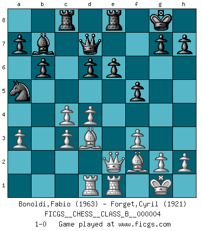 Last move : 1-0 2007 January 19 12:45:41 [Event "FICGS__CHESS__CLASS_B__000004"] [Site "FICGS"] [Date "2006.06.19"] [Round "1"] [White "Bonoldi,Fabio"] [Black "Forget,Cyril"] [Result "1-0"] [WhiteElo "1963"] [BlackElo "1921"] 1.c4 b6 2.Nc3 e6 3.e4 Bb7 4.Nf3 Bb4 5.d3 Ne7 6.Be2 O-O 7.O-O f5 8.e5 Ng6 9.d4 Nc6 10.a3 Bxc3 11.bxc3 Nh4 12.Bf4 Na5 13.Nxh4 Qxh4 14.Bg3 Qe7 15.f3 Rac8 16.Bf2 Rfd8 17.Re1 d6 18.exd6 cxd6 19.Bd3 Qd7 20.Qe2 Re8 21.Rad1 1-0 This chess game has been lost on time (started : 2006.06.19 20:18:36) English Opening Kingside Castling by player Black (move 6) Kingside Castling by player White (move 7) Player White won this chess game. Follow this game move after move (download)Examine moves that smite! A good eye for smites is far more important than a knowledge of strategical principles. (Purdy) Er war ein guter Schachspieler, aber ich kann Leute nicht ausstehen, die 'Heil Hitler' rufen (Über Alexander Aljechin). (Miguel Najdorf) Cuando veas una buena jugada, trata de encontrar otra mejor. (Emanuel Lasker) La guerre est enfant de la passion, la passion est enfant du narcissisme et le narcissisme est l'enfant. (...) Une autre partie ? (Thibault de Vassal) They say poker is a zero-sum game. It must be, because every time I play my sum ends up zero. (Max Shapiro)