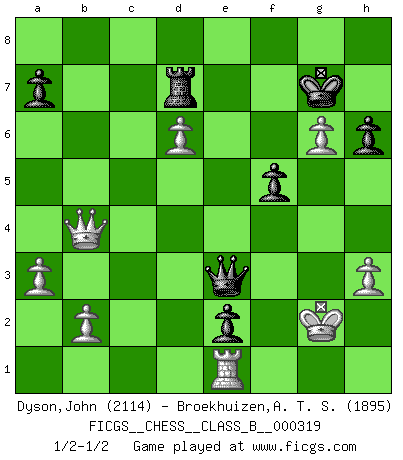 Last move : 1/2-1/2 2020 September 23 15:1:15 [Event "FICGS__CHESS__CLASS_B__000319"] [Site "FICGS"] [Date "2020.02.07"] [Round "1"] [White "Dyson,John"] [Black "Broekhuizen,A. T. S."] [Result "1/2-1/2"] [WhiteElo "2114"] [BlackElo "1895"] 1.Nf3 d5 2.g3 Bg4 3.Bg2 e6 4.c4 c6 5.cxd5 exd5 6.O-O Nd7 7.d3 Bc5 8.Nc3 Ngf6 9.Qb3 b5 10.d4 Bd6 11.h3 Bf5 12.g4 Be6 13.Ng5 b4 14.Nxe6 fxe6 15.Nb1 c5 16.e4 cxd4 17.exd5 e5 18.g5 Nh5 19.Qf3 g6 20.a3 Rf8 21.Qg4 b3 22.Nd2 Nc5 23.Nc4 Nf4 24.Bd2 Rf5 25.Rae1 Nxg2 26.Qxg2 Kf7 27.f4 e4 28.Bb4 Kg7 29.Rd1 d3 30.Ne3 Qe7 31.Nxf5+ gxf5 32.Qg3 Rc8 33.Rc1 e3 34.Rfe1 Re8 35.Bd2 e2 36.Kh2 Rc8 37.Qh4 Kg8 38.Qg3 Rc7 39.g6 h6 40.Rxc5 Rxc5 41.Qxd3 Qe4 42.Qxb3 Rc2 43.Qb7 Bxf4+ 44.Kg1 Rc7 45.Qb4 Be3+ 46.Bxe3 Qxe3+ 47.Kg2 Kg7 48.d6 Rd7 1/2-1/2 Reti : King's Indian attack (Barcza system) Kingside Castling by player White (move 6) This chess game ended in a draw. Follow this game move after move (download)That's what Chess is all about. One day you give your opponent a lesson, the next day he gives you one. (Bobby Fischer) Jede Eröffnung ist gut genug um gespielt zu werden, wenn nur ihr Ruf schlecht genug ist. (Savielly Grigorievitsch Tartakower) Del Ajedrez se ha dicho que la vida no es lo suficientemente larga para él, pero eso es culpa de la vida, no del Ajedrez. (William Ewart Napier) RxDa4 pat (...) Every vice is only an exaggeration of a necessary and virtuous function. (Ralph Waldo Emerson, Journals 1936)