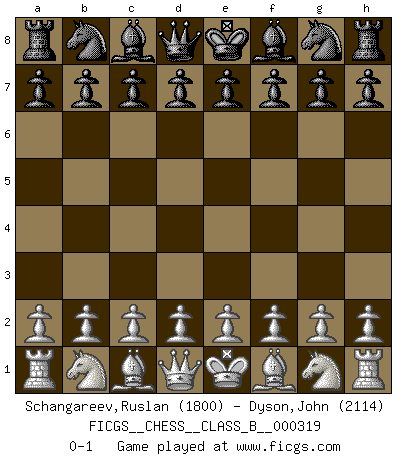 Last move : 0-1 2020 March 18 15:16:51 [Event "FICGS__CHESS__CLASS_B__000319"] [Site "FICGS"] [Date "2020.02.07"] [Round "1"] [White "Schangareev,Ruslan"] [Black "Dyson,John"] [Result "0-1"] [WhiteElo "1800"] [BlackElo "2114"] 0-1 This chess game has been lost on time (started : 2020.02.07 13:1:53) Player Black won this chess game. Follow this game move after move (download)Chess is the gymnasium of the mind. (Blaise Pascal) Dass jemand wie Surab Asmaiparaschwili, der selbst Elopunkte gekauft hat , Vize-Präsident der Fide werden konnte, sagt schon einges über den Zustand dieser Organisation aus. (Joel Lautier) Uno no tiene que jugar muy bien, es suficiente jugar mejor que el oponente. (Siegbert Tarrasch) Psychologiquement, tu dois avoir confiance en toi même, mais cette confiance doit être basée sur des faits. (Robert Fischer) Perhaps the current trend of many chess professionals taking up the more lucrative pastime of poker is not a wholly negative one. It may not be too late for humans to relearn how to take risks in order to innovate and thereby maintain the advanced lifestyles we enjoy. And if it takes a poker-playing supercomputer to remind us that we can't enjoy the rewards without taking the risks, so be it. (The Chess Master and the Computer, by Garry Kasparov - 2010)