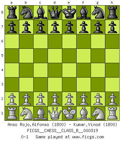 Last move : 0-1 2020 March 18 15:16:51 [Event "FICGS__CHESS__CLASS_B__000319"] [Site "FICGS"] [Date "2020.02.07"] [Round "1"] [White "Anso Rojo,Alfonso"] [Black "Kumar,Vinod"] [Result "0-1"] [WhiteElo "1800"] [BlackElo "1800"] 0-1 This chess game has been lost on time (started : 2020.02.07 13:1:53) Player Black won this chess game. Follow this game move after move (download)The defensive power of a pinned piece is only imaginary. (Aaron Nimzovich) Der Schachmeister von Heute braucht Courage, einen Killerinstinkt, Ausdauer und Arroganz. (Larry Evans) De todos mis libros Rusos, la defensa contiene y difunde el 'calor' mas grande que pudiese verse extraño al observar lo supremamente abstracto que el Ajedrez supuestamente es. (Vladimir Nabokov) Ce n'est pas pour s'amuser qu'il joue aux échecs : il célèbre un culte. (Vladimir Nabokov) I couldn't make any sense out of what this particular thread is about. It sounds like R2 D2 computer speaking. A space fight ?!? Some 'command' problems in Moscow ? Some killers & narcotic addicts attacking some game & a god wannabe ?? (Dinesh De Silva, lost in a russian conflict in FICGS forum)