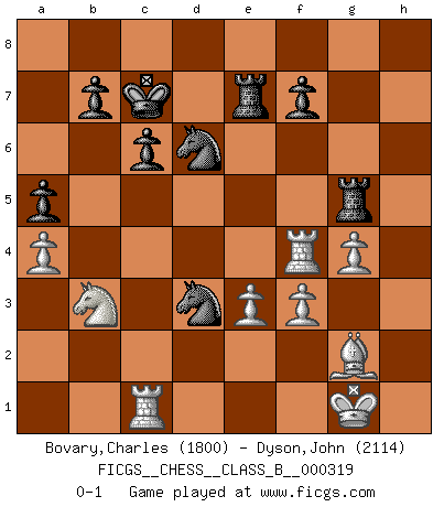 Last move : 0-1 2020 October 17 13:0:51 [Event "FICGS__CHESS__CLASS_B__000319"] [Site "FICGS"] [Date "2020.02.07"] [Round "1"] [White "Bovary,Charles"] [Black "Dyson,John"] [Result "0-1"] [WhiteElo "1800"] [BlackElo "2114"] 1.d4 d5 2.c4 c6 3.Nf3 Nf6 4.Nc3 dxc4 5.a4 Bf5 6.Ne5 Nbd7 7.Nxc4 Qc7 8.g3 e5 9.dxe5 Nxe5 10.Bf4 Nfd7 11.Bg2 g5 12.Ne3 gxf4 13.Nxf5 O-O-O 14.Qc2 fxg3 15.hxg3 Kb8 16.e3 Nc5 17.O-O a5 18.Rab1 Qc8 19.Rfd1 h5 20.Ne2 Ncd3 21.Be4 Nc5 22.Rbc1 Re8 23.Bg2 Rg8 24.Nf4 Rh8 25.Ne2 Rg8 26.Nd6 Bxd6 27.Rxd6 Na6 28.Rd4 Nb4 29.Qc5 h4 30.Qd6+ Qc7 31.Qxc7+ Kxc7 32.Rxh4 Nbd3 33.Rd1 Nxb2 34.Rd2 Nbc4 35.Rc2 Nd6 36.Nd4 Rh8 37.Rf4 Rh5 38.Nb5+ Kd7 39.Nc3 Nec4 40.Ne2 Nb6 41.Rd4 Kc7 42.Nc1 Nd7 43.Nb3 Re7 44.Rc1 Rhe5 45.Rf4 Rg5 46.g4 Ne5 47.f3 Nd3 0-1 QGD Slav : Krause attack Queenside Castling by player Black (move 13) Kingside Castling by player White (move 17) Player Black won this chess game. Follow this game move after move (download)Only sissies Castle. (Rob Sillars) Ich könnte leicht behaupten: Ja,ja, Leonid Breschnew wollte nicht, daß ich Weltmeister werde. In der Tat war die Sache komplizierter. (Viktor Kortschnoi) ¿Porque tengo que perder ante este idiota?. (Aron Nimzovich) Si le désir cupide (et stupide) de gagner est une inépuisable source de souffrance, une combinaison brillante sur l'échiquier est une découverte : le coquelicot qui s'épanouit lorsque apparaît la Voie Lactée. (Arrabal) It's not enough to succeed. Others must fail. (Gore Vidal)