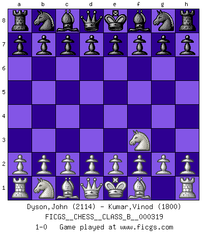 Last move : 1-0 2020 March 19 3:37:44 [Event "FICGS__CHESS__CLASS_B__000319"] [Site "FICGS"] [Date "2020.02.07"] [Round "1"] [White "Dyson,John"] [Black "Kumar,Vinod"] [Result "1-0"] [WhiteElo "2114"] [BlackElo "1800"] 1.Nf3 1-0 This chess game has been lost on time (started : 2020.02.07 13:1:53) Reti Opening Player White won this chess game. Follow this game move after move (download)Let the perfectionist play postal. (Yasser Seirawan) Wenn Capablanka heute auf der Schachbühne erscheinen würde, hätte er ein halbes Jahr gebraucht um sich die Schachtheorie anzueignen. Und dann hätte er alles und jeden besiegt. (Mikhail Moiseyevich Botvinik) El Ajedrez es sobre todo, ¡una pelea!. (Emanuel Lasker) Aidez vos pièces, elles vous aideront. (Paul Morphy) It is a good thing for an uneducated man to read books of quotations. (Winston Churchill)