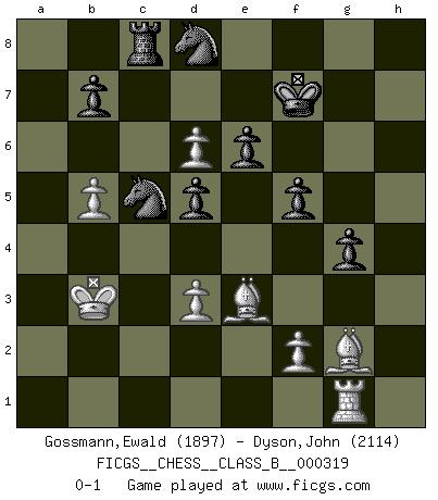 Last move : 0-1 2020 April 22 9:40:58 [Event "FICGS__CHESS__CLASS_B__000319"] [Site "FICGS"] [Date "2020.02.07"] [Round "1"] [White "Gossmann,Ewald"] [Black "Dyson,John"] [Result "0-1"] [WhiteElo "1897"] [BlackElo "2114"] 1.e4 c6 2.d4 d5 3.e5 Bf5 4.Nc3 e6 5.g4 Bg6 6.Nge2 c5 7.Be3 Nc6 8.dxc5 h5 9.Nf4 Bh7 10.Qe2 hxg4 11.O-O-O Qa5 12.Bg2 Bf5 13.Qb5 Qxb5 14.Nxb5 Rc8 15.Nd6+ Bxd6 16.exd6 Nf6 17.Nd3 Nd7 18.b3 a5 19.a3 f6 20.Kb2 Kf7 21.b4 axb4 22.axb4 Be4 23.Rdg1 g5 24.Kb3 f5 25.b5 Nd8 26.h3 gxh3 27.Rxh3 Rxh3 28.Bxh3 g4 29.Bg2 Bxd3 30.cxd3 Nxc5+ 0-1 Caro-Kann : Advance variation Queenside Castling by player White (move 11) Player Black won this chess game. Follow this game move after move (download)By the beauty of his games, the clarity of his play, and the brilliance of his ideas, Fischer made himself an artist of the same stature as Brahms, Rembrandt, and Shakespeare. (David Levy) Rubinstein ist ein Turmendspiel, welches die Götter vor tausenden von Jahren begannen. (Savielly Grigorievitsch Tartakower) El Ajedrez es 99 por ciento táctica. (Teichmann) Vous n'êtes pas toujours obligé de jouer le meilleur coup. Un coup doit être actif, entreprenant, correct et beau ! (David Bronstein) The weakness of an artist is dogma. (Josh Waitzkin)