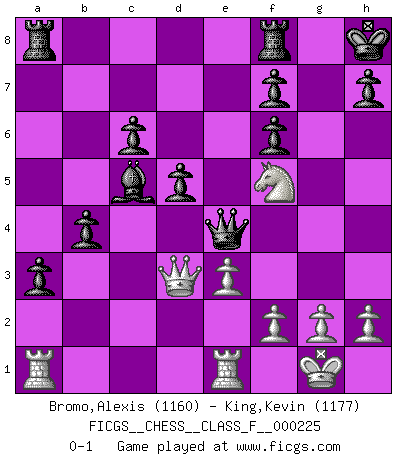 Last move : 0-1 2020 June 13 3:53:58 [Event "FICGS__CHESS__CLASS_F__000225"] [Site "FICGS"] [Date "2020.02.09"] [Round "1"] [White "Bromo,Alexis"] [Black "King,Kevin"] [Result "0-1"] [WhiteElo "1160"] [BlackElo "1177"] 1.d4 d5 2.c4 e6 3.Nc3 Nf6 4.Nf3 Nbd7 5.e3 c6 6.c5 b6 7.b4 Qc7 8.Bb2 Be7 9.Bd3 a5 10.a3 O-O 11.O-O e5 12.dxe5 Nxe5 13.Nd4 Nxd3 14.Qxd3 b5 15.a4 axb4 16.Nce2 bxa4 17.Ng3 Bd7 18.Ngf5 Bxc5 19.Nf3 a3 20.Bxf6 gxf6 21.Nh6+ Kg7 22.Nf5+ Kh8 23.N3h4 Qe5 24.Rfe1 Bxf5 25.Nxf5 Qe4 0-1 QGD : 4.Nf3 Kingside Castling by player Black (move 10) Kingside Castling by player White (move 11) Player Black won this chess game. Follow this game move after move (download)The most important feature of the Chess position is the activity of the pieces. This is absolutely fundamental in all phases of the game: Opening, Middlegame and especially Endgame. The primary constraint on a piece's activity is the Pawn structure. (Michael Stean) Die größte Kunst beim Schach besteht darin dem Gegner nicht zu zeigen was er tun kann. (Garry Kasparov) La maestría del Ajedrez consiste esencialmente en analizar posiciónes de Ajedrez con precisión. (Mikhail Botvinnik) Botvinnik disait en comparant les échecs à la musique: Il existe une science dont le but est l'étude de l'acoustique et des sons. Mais il y a aussi un art qui se sert de l'océan des sons : c'est la musique. De toute évidence, il en est de même pour la pensée. La logique est l'étude des lois de la réflexion et les échecs reflètent, en tant qu'art, le côté logique de la réflexion, sous la forme d'images artistiques... Extrait de Fischer - Spassky, Reykjavik 1972 par Alexander & F. Wyndham (Ed. Solar), p 37. The beginning of wisdom is silence. The second step is listening. (Unknown)