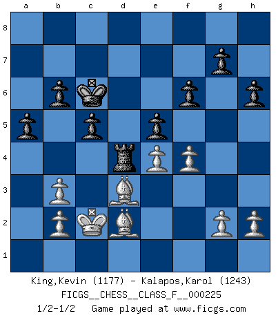 Last move : 1/2-1/2 2020 March 31 0:32:27 [Event "FICGS__CHESS__CLASS_F__000225"] [Site "FICGS"] [Date "2020.02.09"] [Round "1"] [White "King,Kevin"] [Black "Kalapos,Karol"] [Result "1/2-1/2"] [WhiteElo "1177"] [BlackElo "1243"] 1.e4 c5 2.Nf3 Nc6 3.d4 cxd4 4.Nxd4 Nf6 5.Nc3 e5 6.Ndb5 Bb4 7.Nd6+ Bxd6 8.Qxd6 Ng4 9.Be2 Nd4 10.Bxg4 Nxc2+ 11.Kd1 Nxa1 12.Nd5 h6 13.Bd2 b6 14.Qc7 O-O 15.Qxd8 Rxd8 16.Kc1 Bb7 17.Bc3 a5 18.Kb1 Nb3 19.axb3 Bc6 20.Ne7+ Kf8 21.Nxc6 dxc6 22.Rd1 f6 23.Rxd8+ Rxd8 24.Be2 Ke7 25.Kc2 Kd6 26.Bd2 c5 27.Bb5 Kc7 28.f4 Rd4 29.Bd3 Kc6 1/2-1/2 Sicilian : Pelikan (Lasker/Sveshnikov) variation Kingside Castling by player Black (move 14) This chess game ended in a draw. Follow this game move after move (download)Chess is 99 percent tactics. (Teichmann) Dieses schreckliche Gefühl, dass ich gegen eine Maschine spielte, die niemals Fehler macht, zerschmetterte meinen Widerstand. (Mark Taimanov) Bobby Fischer es el jugador de Ajedrez mas grande que jamás haya existido. (Ken Smith) Je fais ceci parce que dans cinquante coups j'obtiendrai cela; je m'appelle Mikhail Moisevitch Botvinnik. (Botvinnik) If you know the enemy and know yourself you need not fear the results of a hundred battles. (Sun Tzu)