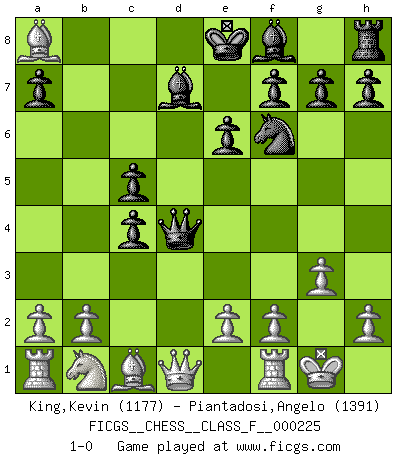Last move : 1-0 2020 March 4 2:10:12 [Event "FICGS__CHESS__CLASS_F__000225"] [Site "FICGS"] [Date "2020.02.09"] [Round "1"] [White "King,Kevin"] [Black "Piantadosi,Angelo"] [Result "1-0"] [WhiteElo "1177"] [BlackElo "1391"] 1.d4 d5 2.Nf3 Nf6 3.g3 e6 4.Bg2 c5 5.O-O Nc6 6.c4 dxc4 7.Ne5 Qxd4 8.Nxc6 bxc6 9.Bxc6+ Bd7 10.Bxa8 1-0 Queen's pawn game Kingside Castling by player White (move 5) Player White won this chess game. Follow this game move after move (download)Good positions don't win games, good moves do. (Gerald Abrahams) Schach ist mein Leben, meine Leidenschaft, was ich gelernt habe und seit meinem 14. Lebensjahr profimässig praktiziere. Darauf zu verzichten, würde mir sehr schwer fallen. (Viktor Kortschnoi) Cuando le juegas a Fischer, no es una cuestion de si vas a ganar o perder. Es una cuestion de si vas a sobrevivir. (Boris Spassky) Il vaut mieux sacrifier les pièces de l'adversaire. (Xavier Tartacover) Do not put your faith in what statistics say until you have carefully considered what they do not say. (William W. Watt)