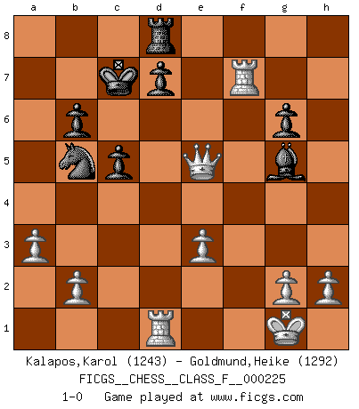 Last move : 1-0 2020 March 18 17:47:21 [Event "FICGS__CHESS__CLASS_F__000225"] [Site "FICGS"] [Date "2020.02.09"] [Round "1"] [White "Kalapos,Karol"] [Black "Goldmund,Heike"] [Result "1-0"] [WhiteElo "1243"] [BlackElo "1292"] 1.d4 Nf6 2.c4 b6 3.Nc3 Bb7 4.Bg5 e6 5.e3 c5 6.d5 exd5 7.cxd5 Be7 8.d6 Bf8 9.Nb5 Na6 10.Nf3 Qb8 11.Be2 Ne4 12.Bf4 Nb4 13.Nc7+ Kd8 14.Nxa8 Bxa8 15.Ne5 Nxd6 16.Nxf7+ Nxf7 17.Bxb8 Be4 18.O-O Be7 19.Bxa7 Kc7 20.a3 Nc6 21.Bb5 Nfe5 22.f4 Nf7 23.Qg4 g6 24.Rad1 Rd8 25.f5 Nxa7 26.Qxe4 Bg5 27.fxg6 hxg6 28.Rxf7 Nxb5 29.Qe5+ 1-0 Queen's Indian Accelerated Kingside Castling by player White (move 18) Player White won this chess game. Follow this game move after move (download)Though most people love to look at the games of the great attacking masters, some of the most successful players in history have been the quiet positional players. They slowly grind you down by taking away your space, tying up your pieces, and leaving you with virtually nothing to do ! (Yasser Seirawan) Frage des Reporters: -Worin besteht das Ziel von Gambiteröffnungen? Antwort: -Auf Kosten der Partie einen Ruf als Angriffspieler zu erwerben.- (Siegbert Tarrasch) La esencia del Ajedrez es pensar acerca de lo que el Ajedrez es. (David Bronstein) Le succès, c'est être capable d'aller d'échec en échec sans perdre son enthousiasme. (Winston Churchill) He who fights with monsters should be careful lest he thereby become a monster. (Friedrich Nietzsche, Beyond Good and Evil)