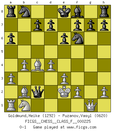 Last move : 0-1 2020 February 24 9:8:7 [Event "FICGS__CHESS__CLASS_F__000225"] [Site "FICGS"] [Date "2020.02.09"] [Round "1"] [White "Goldmund,Heike"] [Black "Puzanov,Vasyl"] [Result "0-1"] [WhiteElo "1292"] [BlackElo "0620"] 1.b4 b5 2.Bb2 Bb7 3.e3 e6 4.a3 a6 5.c4 bxc4 6.Bxc4 Bxg2 7.Nf3 Bxh1 8.Ke2 Bxf3+ 9.Kxf3 Qh4 10.Qg1 Nf6 11.d4 Qe4+ 12.Ke2 Qc2+ 0-1 Polish (Sokolsky) opening Player Black won this chess game. Follow this game move after move (download)All that matters on the Chessboard is good moves. (Bobby Fischer) Das Schach hält seine Meister in eigenen Banden, Fesseln; auf vielerlei Weise formt es ihren Geist, so dass die innere Freiheit selbst des Stärksten beeinflusst wird. (Albert Einstein) La caracteristica mas importante en la posición del Ajedrez es la actividad de las piezas. Esto es absolutamente fundamental en todas las fases del juego: Apertura, Juego Medio y especialmente Finales. La limitación primordial en la actividad de una pieza, es la estructuración de los Peones. (Michael Stean) Horreur, mais aussi harmonie suprême : qu'y avait-il en effet au monde en dehors des échecs ? Le brouillard, l'inconnu, le non-être... (Vladimir Nabokov) War is the child of passion, passion is the child of narcissism and narcissism is the child. (...) Another game ? (Thibault de Vassal)