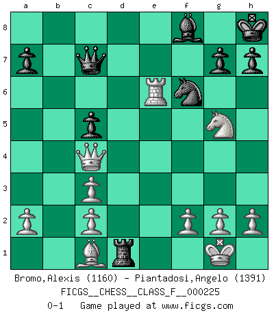 Last move : 0-1 2020 March 14 12:50:36 [Event "FICGS__CHESS__CLASS_F__000225"] [Site "FICGS"] [Date "2020.02.09"] [Round "1"] [White "Bromo,Alexis"] [Black "Piantadosi,Angelo"] [Result "0-1"] [WhiteElo "1160"] [BlackElo "1391"] 1.e4 Nf6 2.Nc3 d5 3.exd5 Nxd5 4.d4 Nxc3 5.bxc3 e6 6.Nf3 c5 7.Bb5+ Bd7 8.Bxd7+ Nxd7 9.O-O Be7 10.Re1 O-O 11.Rb1 Rc8 12.Rxb7 Rc7 13.Rxc7 Qxc7 14.d5 Nf6 15.dxe6 fxe6 16.Rxe6 Rd8 17.Qe2 Bf8 18.Qc4 Kh8 19.Ng5 Rd1+ 0-1 Alekhine's defense : Scandinavian variation Kingside Castling by player White (move 9) Kingside Castling by player Black (move 10) Player Black won this chess game. Follow this game move after move (download)The beauty of a move lies not in its' appearance but in the thought behind it. (Siegbert Tarrasch) Die starken Figuren des Gegners muss man abtauschen. (José Raúl Capablanca) Fischer no está bajo la obligación de nadie. (Joseph Platz) La tactique est l'élément le plus important du milieu de jeu. (Siegbert Tarrasch) Faith : not wanting to know what is true. (Friedrich Nietzsche)