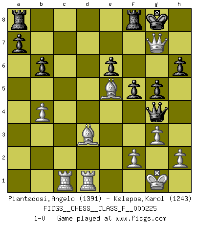 Last move : 1-0 2020 March 22 0:54:0 [Event "FICGS__CHESS__CLASS_F__000225"] [Site "FICGS"] [Date "2020.02.09"] [Round "1"] [White "Piantadosi,Angelo"] [Black "Kalapos,Karol"] [Result "1-0"] [WhiteElo "1391"] [BlackElo "1243"] 1.d4 e6 2.c4 Bb4+ 3.Bd2 Be7 4.Nc3 Nf6 5.Nf3 b6 6.e3 Bb7 7.Be2 d5 8.O-O h6 9.Rc1 O-O 10.cxd5 Nxd5 11.Qc2 Na6 12.Nxd5 Bxd5 13.Bxa6 Bxa2 14.Ne5 c5 15.b4 cxd4 16.Qxa2 dxe3 17.Bxe3 Qd6 18.Nc6 Bf6 19.Rfd1 Qc7 20.g3 Be5 21.Nxe5 Qxe5 22.Bf4 Qf6 23.Qe2 g5 24.Be5 Qf5 25.Bd3 Qh3 26.Qe4 f5 27.Qb7 Qg4 28.Qg7+ 1-0 Queen's pawn : Franco-Indian (Keres) defense Kingside Castling by player White (move 8) Kingside Castling by player Black (move 9) Player White won this chess game. Follow this game move after move (download)There must have been a time when men were demigods, or they could not have invented Chess. (Gustav Schenk) Das typische an einem Großmeister ist, daß er eine gewonnene Position schnell und schmerzlos gewinnt. (Irving Chernev) Alekhine es un poeta que crea un trabajo de arte de algo que raramente inspiraría a otra persona a mandar una tarjeta postal. (Max Euwe) Le moment que je préfère le plus dans une rencontre, c'est celui où je sens que la personnalité de l'adversaire se brise. (Robert Fischer) Watch your thoughts; they become words. Watch your words; they become actions. Watch your actions; they become habits. Watch your habits; they become character. Watch your character; it becomes your destiny. (Frank Outlaw)
