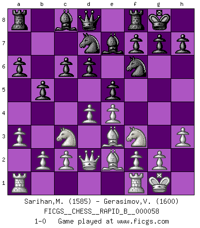 Last move : 1-0 2007 October 2 10:56:18 [Event "FICGS__CHESS__RAPID_B__000058"] [Site "FICGS"] [Date "2007.07.07"] [Round "1"] [White "Sarihan,Mustafa"] [Black "Gerasimov,Vladimir"] [Result "1-0"] [WhiteElo "1585"] [BlackElo "1600"] 1.e4 e5 2.Nf3 d6 3.Nc3 Nf6 4.d4 Nbd7 5.Be2 Be7 6.O-O c6 7.Be3 O-O 8.h3 b5 9.a3 a6 10.Qd2 1-0 This chess game has been lost on time (started : 2007.07.07 22:32:15) Philidor's defense Kingside Castling by player White (move 6) Kingside Castling by player Black (move 7) Player White won this chess game. Follow this game move after move (download)Before the endgame, the Gods have placed the middle game. (Siegbert Tarrasch) Die jungen Leute sollen verstehen, dass sie noch etwas von mir lernen können und müssen. (Viktor Kortschnoi) Mis oponentes también hacen buenas movidas. A veces yo no tomo esas cosas en consideración. (Bobby Fischer) Vous n'êtes pas toujours obligé de jouer le meilleur coup. Un coup doit être actif, entreprenant, correct et beau ! (David Bronstein) The right perception of any matter and a misunderstanding of the same matter do not wholly exclude each other. (Kafka's the trial)