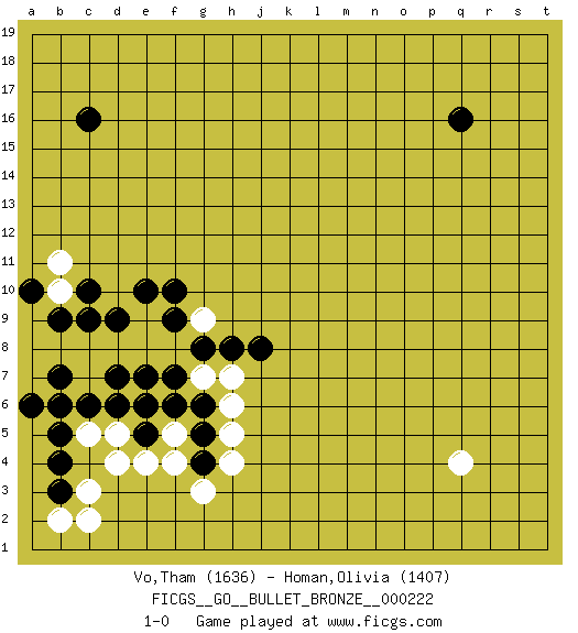 Last move : 1-0 2020 February 9 22:54:24 [Event "FICGS__GO__BULLET_BRONZE__000222"] [Site "FICGS"] [Date "2020.02.09"] [Round "1"] [Black "Vo,Tham"] [White "Homan,Olivia"] [Result "1-0"] [Rating 1 "1636"] [Rating 2 "1407"] 1.q16 q4 2.c16 d4 3.c6 c8 4.e6 f4 5.b4 c3 6.b3 c2 7.c10 e8 8.g6 h4 9.f9 f8 10.g8 g9 11.f10 g7 12.h8 h7 13.f7 h6 14.g5 h5 15.g4 g3 16.e5 e4 17.j8 f5 18.f6 d5 19.d6 c5 20.b5 b2 21.b7 b8 22.b9 a8 23.d9 d8 24.c9 a9 25.a10 a7 26.a6 c7 27.b6 e9 28.e10 b11 29.d7 b10 30.e7 1-0 Here are the names of the openings (joseki) played in the four corners : Corner d4 : d4 c6 Hoshi (Hwajeom, Seongjeom, Xingwei`) 4-4 Point. The star or hoshi (4-4) point, emphasizing influence at the potential expense of territory. Ikken Kakari (Hankan Keolch'im, Yi Gua`jiao~, 1-Space Low Approach). Black 2 is the standard approach move to the 4-4. Corner d16 : c16 b11 Komoku (Somok, Xiao~mu`) 3-4 Point. The komoku (3-4) point is the traditional corner enclosure move.. Player Black won this Go (weiqi, baduk) game. Follow this game move after move (download)Very few good moves are played. (Pierre Audouard) All the biggest technological inventions created by man - the airplane, the automobile, the computer - says little about his intelligence, but speaks volumes about his laziness. (Mark Kennedy)