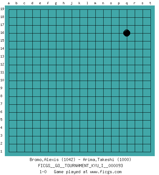 Last move : 1-0 2020 March 11 10:18:11 [Event "FICGS__GO__TOURNAMENT_KYU_I__000093"] [Site "FICGS"] [Date "2020.02.09"] [Round "1"] [Black "Bromo,Alexis"] [White "Arima,Takeshi"] [Result "1-0"] [Rating 1 "1042"] [Rating 2 "1000"] 1.q16 1-0 This go game has been lost on time (started : 2020.02.09 22:55:22) Here are the names of the openings (joseki) played in the four corners : Player Black won this Go (weiqi, baduk) game. Follow this game move after move (download)Error is one of the sources of transformation. (Pierre Audouard) The project of the man are lower than those of the sky. (Chinese proverb)