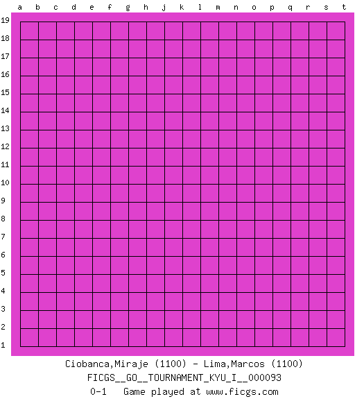 Last move : 0-1 2020 March 11 10:18:11 [Event "FICGS__GO__TOURNAMENT_KYU_I__000093"] [Site "FICGS"] [Date "2020.02.09"] [Round "1"] [Black "Ciobanca,Miraje"] [White "Lima,Marcos"] [Result "0-1"] [Rating 1 "1100"] [Rating 2 "1100"] 0-1 This go game has been lost on time (started : 2020.02.09 22:55:22) Here are the names of the openings (joseki) played in the four corners : Player White won this Go (weiqi, baduk) game. Follow this game move after move (download)Very few good moves are played. (Pierre Audouard) Opportunities multiply as they are seized. (Sun Tzu)