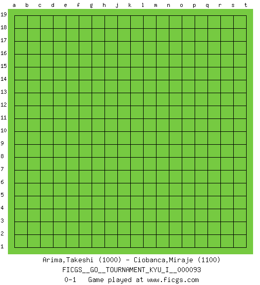 Last move : 0-1 2020 March 11 10:18:11 [Event "FICGS__GO__TOURNAMENT_KYU_I__000093"] [Site "FICGS"] [Date "2020.02.09"] [Round "1"] [Black "Arima,Takeshi"] [White "Ciobanca,Miraje"] [Result "0-1"] [Rating 1 "1000"] [Rating 2 "1100"] 0-1 This go game has been lost on time (started : 2020.02.09 22:55:22) Here are the names of the openings (joseki) played in the four corners : Player White won this Go (weiqi, baduk) game. Follow this game move after move (download)Go is to western chess what philosophy is to double entry accounting. (from Shibumi, by Trevanian) If only faces could talk... (Pat Summerall, Sportscaster during the Super Bowl)