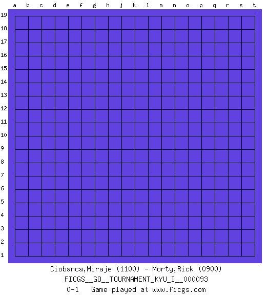 Last move : 0-1 2020 March 11 10:18:11 [Event "FICGS__GO__TOURNAMENT_KYU_I__000093"] [Site "FICGS"] [Date "2020.02.09"] [Round "1"] [Black "Ciobanca,Miraje"] [White "Morty,Rick"] [Result "0-1"] [Rating 1 "1100"] [Rating 2 "0900"] 0-1 This go game has been lost on time (started : 2020.02.09 22:55:22) Here are the names of the openings (joseki) played in the four corners : Player White won this Go (weiqi, baduk) game. Follow this game move after move (download)Only amateurs try to come up with fancy moves. (Anonymous) Indecision is the key to flexibility. (Unknown)