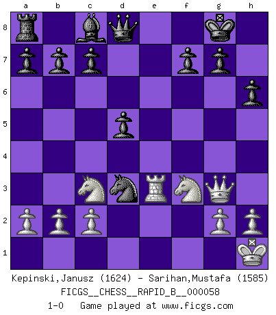 Last move : 1-0 2007 October 19 1:11:42 [Event "FICGS__CHESS__RAPID_B__000058"] [Site "FICGS"] [Date "2007.07.07"] [Round "1"] [White "Kepinski,Janusz"] [Black "Sarihan,Mustafa"] [Result "1-0"] [WhiteElo "1624"] [BlackElo "1585"] 1.e4 e5 2.Bc4 Nf6 3.d4 exd4 4.Nf3 Nxe4 5.Qxd4 Nf6 6.Bg5 Nc6 7.Qh4 Be7 8.O-O O-O 9.Re1 h6 10.Bd2 d5 11.Bd3 Ng4 12.Qg3 Bc5 13.Be3 Nxe3 14.fxe3 Re8 15.Nc3 Rxe3 16.Rxe3 Bxe3+ 17.Kh1 Nb4 18.Re1 Nxd3 19.Rxe3 1-0 This chess game has been lost on time (started : 2007.07.07 22:32:15) Bishop's Opening : Urusov gambit Kingside Castling by player White (move 8) Kingside Castling by player Black (move 8) Player White won this chess game. Follow this game move after move (download)Chess is a fairy tale of 1001 blunders. (Savielly Tartakower) Wie bekannt hörte Morphy 1859 auf, Schach zu spielen. Seine Enttäuschung galt nicht so sehr dem Schach, wie den Schachspielern. (Robert James Fischer) La pasion por jugar al Ajedrez es una de las mas inexplicables en el mundo. (H.G. Wells) Mais n'est-ce pas déjà le limiter injurieusement que d'appeler les échecs un jeu? N'est-ce pas aussi une science, un art, ou quelque chose qui, comme le cercueil de Mahomet entre ciel et terre, est suspendu entre l'un et l'autre, et qui réunit un nombre incroyable de contraires ? (Stefan Zweig) I don't diet. I just don't eat as much as I'd like to. (Linda Evangelista, supermodel)