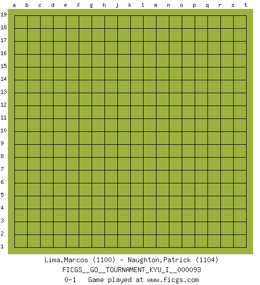 Last move : 0-1 2020 March 11 10:18:11 [Event "FICGS__GO__TOURNAMENT_KYU_I__000093"] [Site "FICGS"] [Date "2020.02.09"] [Round "1"] [Black "Lima,Marcos"] [White "Naughton,Patrick"] [Result "0-1"] [Rating 1 "1100"] [Rating 2 "1104"] 0-1 This go game has been lost on time (started : 2020.02.09 22:55:22) Here are the names of the openings (joseki) played in the four corners : Player White won this Go (weiqi, baduk) game. Follow this game move after move (download)Territory is a closed space where time no longer exists. The transformation around it slower alter it, and sometimes it cracks open like a rotten egg at the least shock. (Pierre Audouard) Luck is the residue of design. (John Milton)