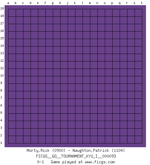 Last move : 0-1 2020 March 11 10:18:11 [Event "FICGS__GO__TOURNAMENT_KYU_I__000093"] [Site "FICGS"] [Date "2020.02.09"] [Round "1"] [Black "Morty,Rick"] [White "Naughton,Patrick"] [Result "0-1"] [Rating 1 "0900"] [Rating 2 "1104"] 0-1 This go game has been lost on time (started : 2020.02.09 22:55:22) Here are the names of the openings (joseki) played in the four corners : Player White won this Go (weiqi, baduk) game. Follow this game move after move (download)One big eye kills one small eye. (Anonymous) Treat your password like your toothbrush. Don't let anybody else use it, and get a new one every six months. (Clifford Stoll)