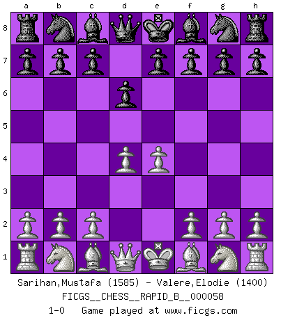 Last move : 1-0 2007 August 28 5:58:45 [Event "FICGS__CHESS__RAPID_B__000058"] [Site "FICGS"] [Date "2007.07.07"] [Round "1"] [White "Sarihan,Mustafa"] [Black "Valere,Elodie"] [Result "1-0"] [WhiteElo "1585"] [BlackElo "1400"] 1.e4 d6 2.d4 1-0 This chess game has been lost on time (started : 2007.07.07 22:32:15) King's pawn Opening Player White won this chess game. Follow this game move after move (download)Chess is the gymnasium of the mind. (Blaise Pascal) Jeder leidlich begabte Spieler, er braucht keineswegs hervorragend veranlagt zu sein, kann es zum Meister bringen. Aber das ist ja auch gar nicht nötig! Der richtige Standpunkt ist es, zu seinem Vergnügen zu spielen, und man glaube ja nicht, dass der Genuss proportional dem Können sei. (Siegbert Tarrasch) Antes de los Finales, los dioses han colocado el Juego Medio. (Siegbert Tarrasch) Vous m'avez demandé de vous exposer quel est le fondement de la prière. Je ne fais que préparer les pièces du jeu sur la table... Nous sera-t-il permis d'en adopter les règles et si nous les appliquons scrupuleusement nous ne tarderons pas à faire mat le Roi divin ! Il ne pourra échapper à nos mains. (Sainte Thérèse d'Avila, Chemin de perfection) Depression is just anger without enthusiasm. (Unknown)