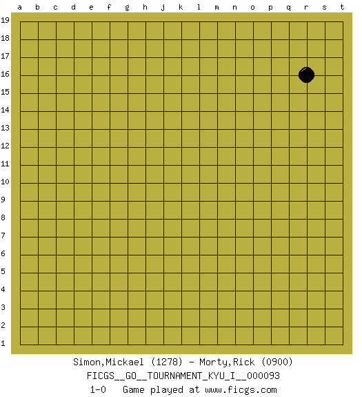 Last move : 1-0 2020 March 11 10:18:11 [Event "FICGS__GO__TOURNAMENT_KYU_I__000093"] [Site "FICGS"] [Date "2020.02.09"] [Round "1"] [Black "Simon,Mickael"] [White "Morty,Rick"] [Result "1-0"] [Rating 1 "1278"] [Rating 2 "0900"] 1.r16 1-0 This go game has been lost on time (started : 2020.02.09 22:55:22) Here are the names of the openings (joseki) played in the four corners : Player Black won this Go (weiqi, baduk) game. Follow this game move after move (download)In an unreasonable situation, an unreasonable move is reasonable. (Tamino) CHESS, n. f. [echecs, Fr.] A nice and abstruse game, in which two sets of puppets are moved in opposition to each other. (Dr Samuel Johnson, A Dictionary Of The English Language, 1755)