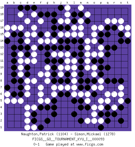 Last move : 0-1 2020 March 29 13:56:14 [Event "FICGS__GO__TOURNAMENT_KYU_I__000093"] [Site "FICGS"] [Date "2020.02.09"] [Round "1"] [Black "Naughton,Patrick"] [White "Simon,Mickael"] [Result "0-1"] [Rating 1 "1104"] [Rating 2 "1278"] 1.q16 d4 2.q4 d17 3.c15 e16 4.d12 r17 5.r16 q17 6.r13 p16 7.p15 o16 8.q10 o3 9.l3 r6 10.r5 q6 11.p3 o4 12.h3 s16 13.s15 s17 14.c6 d14 15.c14 d6 16.c7 c5 17.e3 k17 18.j16 j17 19.k16 l16 20.h16 e8 21.d9 f14 22.j14 f6 23.j6 c16 24.d13 d15 25.g12 o15 26.p14 n13 27.h17 d3 28.e2 d2 29.r8 s7 30.s8 s5 31.s4 p5 32.r3 t15 33.s14 b16 34.b15 a15 35.b13 e1 36.f1 d1 37.g2 n6 38.o6 o7 39.n8 g10 40.h9 f9 41.h10 n11 42.o11 n10 43.o8 p7 44.t5 p8 45.p9 s6 46.m5 o12 47.p11 d8 48.c8 o9 49.q8 c9 50.b9 c10 51.b10 c11 52.b11 c12 53.d10 d11 54.c13 e11 55.m8 m6 56.l5 l6 57.k6 l8 58.m9 l9 59.m10 l10 60.m11 k12 61.m12 n12 62.m13 n14 63.m14 j10 64.h11 k7 65.m7 l7 66.j11 l11 67.k13 j12 68.h13 l15 69.l14 p2 70.q2 n2 71.p1 o2 72.m2 n5 73.m4 j9 74.j8 k11 75.k9 k10 76.k8 j7 77.h8 h7 78.g7 h6 79.g6 g5 80.h5 g8 81.h4 h12 82.g11 e12 83.f13 e13 84.b12 f17 85.h18 k19 86.e19 g9 87.c19 k15 88.k14 m15 89.a14 a16 90.f18 b5 91.b6 e18 92.g18 c18 93.d19 p4 94.q3 g14 95.g13 h14 96.j13 j15 97.l17 m17 98.l18 k18 99.m18 n18 100.n17 m19 101.h15 m16 102.f15 e15 103.t14 p13 104.q13 o14 105.q15 p12 106.g4 f5 107.q12 q5 108.j19 g15 109.l12 a6 110.a7 a5 111.b8 e4 112.f4 o10 113.p10 r4 114.s2 d7 115.n4 t16 116.n7 f7 0-1 Here are the names of the openings (joseki) played in the four corners : Corner d16 : d17 c15 Komoku (Somok, Xiao~mu`) 3-4 Point. The komoku (3-4) point is the traditional corner enclosure move.. Ikken Kakari (Hankan Keolch'im, Yi Gua`jiao~, 1-Space Low Pincer). The small knight move is the basic approach move to the 3-4 point stone. It has been continually used for over four centuries. There are limitless variations, with new moves constantly being discovered. Black 2 opens the door to a treaure store of joseki. Corner q16 : q16 r17 Hoshi (Hwajeom, Seongjeom, Xingwei`) 4-4 Point. The star or hoshi (4-4) point, emphasizing influence at the potential expense of territory. Corner q4 : q4 o3 Hoshi (Hwajeom, Seongjeom, Xingwei`) 4-4 Point. The star or hoshi (4-4) point, emphasizing influence at the potential expense of territory. Ikken Kakari (Hankan Keolch'im, Yi Gua`jiao~, 1-Space Low Approach). White 2 is the standard approach move to the 4-4. Corner d4 : d4 h3 Hoshi (Hwajeom, Seongjeom, Xingwei`) 4-4 Point. The star or hoshi (4-4) point, emphasizing influence at the potential expense of territory. Player White won this Go (weiqi, baduk) game. Follow this game move after move (download)The enemy's vital point is your own. (Anonymous) Wisdom doesn't necessarily come with age. Sometimes age just shows up all by itself. (Tom Watson)