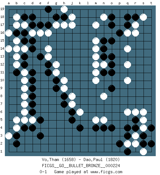 Last move : 0-1 2020 February 9 23:44:51 [Event "FICGS__GO__BULLET_BRONZE__000224"] [Site "FICGS"] [Date "2020.02.09"] [Round "1"] [Black "Vo,Tham"] [White "Dao,Paul"] [Result "0-1"] [Rating 1 "1658"] [Rating 2 "1820"] 1.q4 q16 2.d4 d16 3.k4 r6 4.r5 q6 5.o4 q10 6.o17 m17 7.o15 q14 8.q18 r17 9.r18 s18 10.q17 r16 11.p16 j17 12.f17 f16 13.e17 e16 14.d17 c17 15.c18 b18 16.c16 b17 17.c15 g17 18.g18 h17 19.h18 j18 20.d18 c14 21.d15 b15 22.b16 a16 23.b14 a14 24.a15 r3 25.q3 b15 26.d14 b13 27.c13 b14 28.c12 b12 29.b11 c11 30.d11 c10 31.d10 c9 32.d9 c8 33.d8 c7 34.d7 c6 35.d6 d5 36.e5 c5 37.c4 b4 38.b3 b5 39.e3 s5 40.r4 s4 41.s3 r2 42.s2 q2 43.p2 t3 44.t2 s1 45.t4 s6 46.q1 h19 47.f19 f14 48.e13 f13 49.f12 g12 50.f11 g11 51.g10 h10 52.g9 h9 53.h8 j8 54.h7 j7 55.j6 k6 56.j5 m15 57.o13 m13 58.o11 q12 59.o9 n12 60.o12 m10 61.n11 m11 62.n13 m12 63.n14 m14 64.n15 a3 65.b2 m5 66.m4 n5 67.n4 n18 68.o18 n8 0-1 Here are the names of the openings (joseki) played in the four corners : Corner q4 : q4 r6 Hoshi (Hwajeom, Seongjeom, Xingwei`) 4-4 Point. The star or hoshi (4-4) point, emphasizing influence at the potential expense of territory. Ikken Kakari (Hankan Keolch'im, Yi Gua`jiao~, 1-Space Low Approach). White 2 is the standard approach move to the 4-4. Corner q16 : q16 o17 Hoshi (Hwajeom, Seongjeom, Xingwei`) 4-4 Point. The star or hoshi (4-4) point, emphasizing influence at the potential expense of territory. Ikken Kakari (Hankan Keolch'im, Yi Gua`jiao~, 1-Space Low Approach). Black 2 is the standard approach move to the 4-4. Corner d4 : d4 c9 Hoshi (Hwajeom, Seongjeom, Xingwei`) 4-4 Point. The star or hoshi (4-4) point, emphasizing influence at the potential expense of territory. Player White won this Go (weiqi, baduk) game. Follow this game move after move (download)Eyes win semiais. (Anonymous) Employ the attack like tactic of defense. (Chinese proverb)