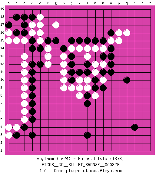 Last move : 1-0 2020 February 10 1:52:11 [Event "FICGS__GO__BULLET_BRONZE__000228"] [Site "FICGS"] [Date "2020.02.10"] [Round "1"] [Black "Vo,Tham"] [White "Homan,Olivia"] [Result "1-0"] [Rating 1 "1624"] [Rating 2 "1373"] 1.r4 q16 2.d3 d17 3.d15 g17 4.c17 d16 5.c16 e15 6.e14 c15 7.d14 b15 8.d18 e18 9.c18 e17 10.b16 a16 11.a17 a15 12.b18 c13 13.f15 e16 14.d12 c12 15.d11 c11 16.d10 c10 17.d9 c9 18.d8 c8 19.d7 c7 20.d6 c6 21.d5 c5 22.c4 b4 23.b3 a4 24.l3 a3 25.q10 f14 26.g15 f13 27.e12 f12 28.h14 h13 29.j13 h12 30.j12 h11 31.j11 h10 32.k9 j14 33.j15 k14 34.k15 l14 35.l15 m14 36.m15 n14 37.o16 o15 38.n15 p16 39.o14 p15 40.o13 m12 41.j10 h9 42.n11 m11 43.m10 n12 44.o12 n10 45.o11 l10 46.m9 l9 47.l8 m8 48.n9 k8 49.l7 j9 50.l11 k10 51.k11 k9 52.l12 l13 53.n13 1-0 Here are the names of the openings (joseki) played in the four corners : Corner d16 : d17 d15 Komoku (Somok, Xiao~mu`) 3-4 Point. The komoku (3-4) point is the traditional corner enclosure move.. Ikken Takagakari (Hankan Nop'dakeolch'im, Yi Gaogua`jiao~, 1-Space High Approach). The 5-4 approach move has become more popular in modern times, as modern Go emphasizes speed and influence. Player Black won this Go (weiqi, baduk) game. Follow this game move after move (download)A basic: Don't push too hard. (Jansteen) The general who wins the battle makes many calculations in his temple before the battle is fought. The general who loses makes but few calculations beforehand. (Sun Tzu)