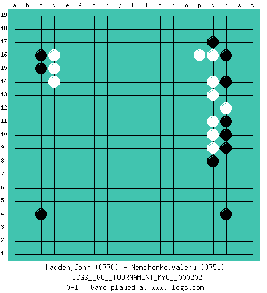 Last move : 0-1 2020 March 31 7:5:10 [Event "FICGS__GO__TOURNAMENT_KYU__000202"] [Site "FICGS"] [Date "2020.02.10"] [Round "1"] [Black "Hadden,John"] [White "Nemchenko,Valery"] [Result "0-1"] [Rating 1 "0770"] [Rating 2 "0751"] 1.c4 q16 2.r4 d16 3.r16 q10 4.r10 q11 5.r11 r12 6.q8 q9 7.r9 q13 8.r14 q14 9.q17 p16 10.c16 d15 11.c15 d14 0-1 This go game has been lost on time (started : 2020.02.10 7:58:57) Here are the names of the openings (joseki) played in the four corners : Corner q16 : q16 r16 Hoshi (Hwajeom, Seongjeom, Xingwei`) 4-4 Point. The star or hoshi (4-4) point, emphasizing influence at the potential expense of territory. Corner d16 : d16 c16 Hoshi (Hwajeom, Seongjeom, Xingwei`) 4-4 Point. The star or hoshi (4-4) point, emphasizing influence at the potential expense of territory. Player White won this Go (weiqi, baduk) game. Follow this game move after move (download)Don't make empty triangles. (Anonymous) It's only after you lost everything, Tyler says, that you're free to do anything. (Chuck Palahniuk, Fight Club)