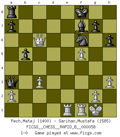 Last move : 1-0 2007 November 18 19:24:50 [Event "FICGS__CHESS__RAPID_B__000058"] [Site "FICGS"] [Date "2007.07.07"] [Round "1"] [White "Pech,Matej"] [Black "Sarihan,Mustafa"] [Result "1-0"] [WhiteElo "1400"] [BlackElo "1585"] 1.d4 Nf6 2.c4 e6 3.Nf3 d5 4.Nc3 c6 5.e3 Nbd7 6.Bd3 Bd6 7.O-O O-O 8.Qc2 dxc4 9.Bxc4 e5 10.Bb3 Re8 11.Ng5 Rf8 12.dxe5 Bxe5 13.f4 Bxc3 14.bxc3 h6 15.Ba3 c5 16.Nxf7 Rxf7 17.e4 Qa5 18.Bxf7+ Kxf7 19.Qb3+ Ke8 20.e5 c4 21.Qxc4 Qxa3 22.exf6 Nxf6 23.Rad1 Bg4 24.Rde1+ Kf8 25.f5 Bh5 26.h3 Bf7 27.Qc7 b5 28.Qc6 1-0 This chess game has been lost on time (started : 2007.07.07 22:32:15) Queen's pawn game Kingside Castling by player White (move 7) Kingside Castling by player Black (move 7) Player White won this chess game. Follow this game move after move (download)In complicated positions, Bobby Fischer hardly had to be afraid of anybody. (Paul Keres) Wenn du auf das Glück wartest, wird das Leben ziemlich langweilig. (Mikhail Nekhemyevich Tal) De eso se trata el Ajedrez. Un día le das una lección a tu oponente y al día siguiente el te da una a tí. (Bobby Fischer) Demandez au pauvre Cg1 ce qu'il en pense. Eduard Gufeld à propos de la variante Saemisch de l'Est-Indienne. Winning isn't everything... but losing is nothing. (Mednis)