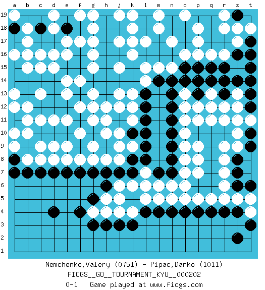 Last move : 0-1 2020 November 7 17:16:18 [Event "FICGS__GO__TOURNAMENT_KYU__000202"] [Site "FICGS"] [Date "2020.02.10"] [Round "1"] [Black "Nemchenko,Valery"] [White "Pipac,Darko"] [Result "0-1"] [Rating 1 "0751"] [Rating 2 "1011"] 1.d4 q16 2.q4 d16 3.k10 k4 4.d10 k11 5.q10 p5 6.p4 q5 7.o4 o5 8.n4 n5 9.m4 m5 10.l4 l5 11.k3 j4 12.j3 h4 13.h3 g4 14.g3 k9 15.l10 j10 16.l9 j8 17.k8 j9 18.k7 k6 19.l6 l7 20.l8 m6 21.m7 l6 22.j7 j6 23.h7 k16 24.l11 k12 25.l12 k13 26.l13 l14 27.m14 m15 28.n14 n15 29.o15 o16 30.p15 p16 31.q15 r16 32.r15 g8 33.g7 f8 34.f7 e8 35.e7 d8 36.d7 c8 37.c7 b8 38.b7 h8 39.a8 a9 40.a7 b10 41.h6 h5 42.f4 o7 43.n7 o8 44.n8 o9 45.n9 o10 46.n10 o11 47.n11 o12 48.n12 o13 49.n13 n6 50.g5 r5 51.r4 s5 52.s4 q13 53.r13 r12 54.q14 s13 55.r14 s11 56.s14 q11 57.p13 q12 58.o14 p12 59.p14 g13 60.s16 s17 61.t16 r18 62.t17 t18 63.t13 s12 64.t12 t11 65.t14 t4 66.t3 t5 67.s2 e11 68.k14 l15 69.j14 j13 70.h14 g15 71.g14 f14 72.h13 h12 73.f13 g12 74.j11 j12 75.f15 e14 76.h15 g16 77.h16 g17 78.h17 g18 79.h18 j17 80.j18 k18 81.j16 k17 82.k15 j19 83.h19 k19 84.f16 g19 85.l16 j15 86.n16 n17 87.m16 h11 88.m17 m18 89.k5 j5 90.n18 l17 91.b11 c11 92.c10 d11 93.e10 c9 94.f11 f12 95.a11 b12 96.a10 a12 97.o17 p17 98.o18 p18 99.e15 d15 100.d14 e13 101.c14 c15 102.b14 b15 103.a15 a16 104.a14 b17 105.d13 f17 106.d12 s15 107.t15 e16 108.c12 f10 109.f9 g11 110.g10 o19 111.n19 m19 112.q9 r9 113.r10 s9 114.q8 r8 115.q7 r7 116.q6 r6 117.p6 s10 118.a11 d9 119.f11 e9 120.b11 f10 121.b13 a10 122.a18 b18 123.s19 s18 124.a11 o6 125.b19 r19 126.c18 b11 127.c17 c16 128.d17 e17 129.e18 b16 130.f18 f19 131.e19 d19 132.c19 d18 133.e18 a19 134.e12 a13 135.c18 c13 136.s7 p7 137.s8 r11 138.p10 p9 139.s6 p8 140.t6 p11 141.t9 g9 142.t10 h10 0-1 Follow this game move after move (download)Don't make dango's. (Anonymous) Work expands to fill the time available. (C. Northcote Parkinson, in Parkinson's Laws)