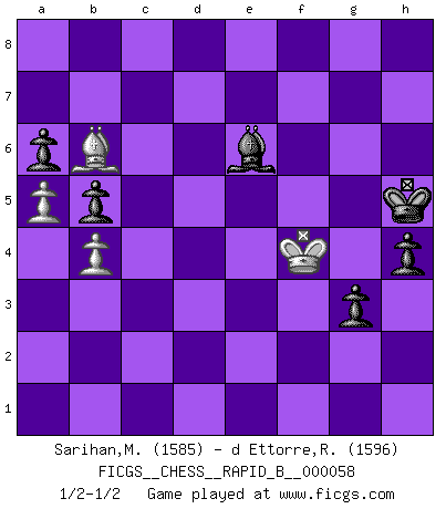 Last move : 1/2-1/2 2007 November 1 1:9:47 [Event "FICGS__CHESS__RAPID_B__000058"] [Site "FICGS"] [Date "2007.07.07"] [Round "1"] [White "Sarihan,Mustafa"] [Black "d Ettorre,Rodolfo"] [Result "1/2-1/2"] [WhiteElo "1585"] [BlackElo "1596"] 1.e4 e5 2.Nf3 Nc6 3.Bc4 Nf6 4.Ng5 Bc5 5.Nxf7 Qe7 6.Nxh8 Bxf2+ 7.Kf1 d5 8.exd5 Nd4 9.d6 cxd6 10.c3 Bg4 11.Qa4+ Kf8 12.d3 Nh5 13.Be6 Qxe6 14.Qc4 Bh4 15.Qxe6 Nxe6 16.g3 Bxg3 17.hxg3 Nxg3+ 18.Kg2 Nxh1 19.Kxh1 Ke7 20.Be3 Rxh8 21.Nd2 b6 22.a4 d5 23.a5 d4 24.Bg1 b5 25.cxd4 exd4 26.Re1 Kd6 27.Re4 Bf5 28.Re1 Rd8 29.Bh2+ Ke7 30.Nf3 a6 31.Ng5 g6 32.Nxe6 Bxe6 33.Bf4 h6 34.Kg1 g5 35.Be5 h5 36.Re4 Kf7 37.Rxd4 Rxd4 38.Bxd4 h4 39.Bf2 Kg6 40.Kf1 Kh5 41.Bb6 g4 42.Ke2 g3 43.Kf3 Bf5 44.b4 Bxd3 45.Bc5 Bc2 46.Kf4 Be4 47.Ba7 Bd5 48.Bd4 Be6 49.Bb6 Bd5 50.Bd4 Be6 51.Bb6 Bd5 52.Bd4 Be6 53.Bb6 1/2-1/2 Two knights defense : Wilkes Barre (Traxler) variation 10 pieces endgame at move 44 : White KBPP , Black KBPPPP WHITE : King + 1 Bishop 2 Pawns BLACK : King + 1 Bishop 4 Pawns This chess game ended in a draw. Follow this game move after move (download)I prefer to lose a really good game than to win a bad one. (David Levy) Taktik ist was man tun muß, wenn etwas zu tun ist. Strategie ist was man tun muß, wenn nichts zu tun ist. (Savielly Grigorievitsch Tartakower) Del Ajedrez se ha dicho que la vida no es lo suficientemente larga para él, pero eso es culpa de la vida, no del Ajedrez. (William Ewart Napier) RxDa4 pat (...) There is far too much law for those who can afford it and far too little for those who cannot. (Derek Bok)
