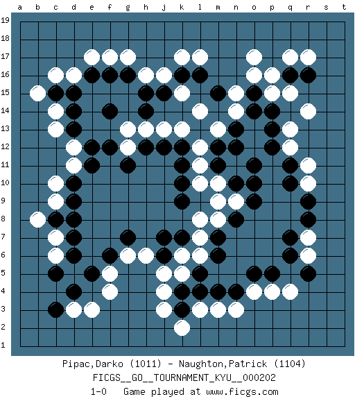 Last move : 1-0 2020 July 23 1:36:11 [Event "FICGS__GO__TOURNAMENT_KYU__000202"] [Site "FICGS"] [Date "2020.02.10"] [Round "1"] [Black "Pipac,Darko"] [White "Naughton,Patrick"] [Result "1-0"] [Rating 1 "1011"] [Rating 2 "1104"] 1.d4 q4 2.q16 d16 3.k10 o17 4.k16 l17 5.l16 k17 6.c15 c16 7.d15 g17 8.g16 f17 9.f16 c10 10.q10 n3 11.m4 m3 12.k3 r7 13.p5 p4 14.n4 o4 15.o5 r14 16.d10 c9 17.q7 r6 18.q6 c6 19.d6 f4 20.c5 c7 21.d7 d11 22.e11 d12 23.e12 g6 24.d9 j4 25.k4 j5 26.j6 h6 27.j7 k5 28.l5 k6 29.k7 l6 30.m6 l7 31.m7 l8 32.k9 m8 33.n8 j3 34.g7 r11 35.q11 r10 36.r9 q12 37.p12 q13 38.p13 e3 39.f6 f5 40.e5 d3 41.c3 m10 42.m11 n9 43.n10 n11 44.o10 l11 45.m12 l10 46.k12 l12 47.l13 m13 48.n12 k13 49.k11 l14 50.n13 j13 51.j12 h13 52.h12 g12 53.g11 g13 54.f12 c14 55.d13 c13 56.d14 b15 57.e16 e17 58.f14 r17 59.o9 m9 60.o11 q17 61.r16 p16 62.c8 b8 63.d8 p15 64.h14 j16 65.j15 h16 66.h15 k15 67.m15 n14 68.o14 n15 69.o15 o16 70.p14 q15 71.r8 l3 72.l4 k2 73.r5 1-0 Here are the names of the openings (joseki) played in the four corners : Corner q16 : q16 o17 Hoshi (Hwajeom, Seongjeom, Xingwei`) 4-4 Point. The star or hoshi (4-4) point, emphasizing influence at the potential expense of territory. Ikken Kakari (Hankan Keolch'im, Yi Gua`jiao~, 1-Space Low Approach). White 2 is the standard approach move to the 4-4. Corner d16 : d16 c15 Hoshi (Hwajeom, Seongjeom, Xingwei`) 4-4 Point. The star or hoshi (4-4) point, emphasizing influence at the potential expense of territory. Corner d4 : d4 c9 Hoshi (Hwajeom, Seongjeom, Xingwei`) 4-4 Point. The star or hoshi (4-4) point, emphasizing influence at the potential expense of territory. Player Black won this Go (weiqi, baduk) game. Follow this game move after move (download)If your stone is capped, play the knight's move. (Anonymous) They say poker is a zero-sum game. It must be, because every time I play my sum ends up zero. (Max Shapiro)