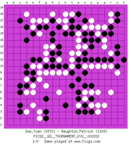 Last move : 1-0 2020 March 20 16:33:13 [Event "FICGS__GO__TOURNAMENT_KYU__000202"] [Site "FICGS"] [Date "2020.02.10"] [Round "1"] [Black "Dao,Tuan"] [White "Naughton,Patrick"] [Result "1-0"] [Rating 1 "0970"] [Rating 2 "1104"] 1.c4 q4 2.d16 q16 3.o3 r6 4.k4 f17 5.h17 f15 6.d14 d18 7.c17 k17 8.h15 h16 9.g16 h18 10.j16 g17 11.f16 j17 12.d10 e4 13.g3 e6 14.c6 d8 15.d7 e7 16.e8 f8 17.e9 g7 18.g10 j6 19.g5 g9 20.h10 h9 21.j10 j9 22.k10 k16 23.k15 o17 24.l15 q13 25.r16 r17 26.r15 r10 27.s17 r18 28.q15 p16 29.s13 r12 30.s12 s11 31.s18 m4 32.m3 o4 33.n4 n5 34.n3 p3 35.o5 p4 36.m5 n6 37.m6 d6 38.c7 d3 39.c3 f3 40.g2 f2 41.n7 o6 42.o7 p6 43.l7 l12 44.m11 m12 45.n12 n13 46.o13 m14 47.n14 m13 48.o11 m15 49.l16 m17 50.l17 l18 51.m16 n16 52.n15 o14 53.o15 p15 54.p14 q14 55.m18 k18 56.n17 o16 57.o14 l11 58.m10 l10 59.l9 m9 60.n9 n10 61.n11 o10 62.p11 p10 63.q11 k9 64.m8 f10 65.f11 e10 66.e11 f9 67.d9 g11 68.j12 j11 69.h11 g12 70.h12 g13 71.h14 h13 72.j13 e16 73.e15 e17 74.r11 q10 75.s10 s9 76.t11 1-0 Here are the names of the openings (joseki) played in the four corners : Corner q4 : q4 o3 Hoshi (Hwajeom, Seongjeom, Xingwei`) 4-4 Point. The star or hoshi (4-4) point, emphasizing influence at the potential expense of territory. Ikken Kakari (Hankan Keolch'im, Yi Gua`jiao~, 1-Space Low Approach). Black 2 is the standard approach move to the 4-4. Corner d16 : d16 f17 Hoshi (Hwajeom, Seongjeom, Xingwei`) 4-4 Point. The star or hoshi (4-4) point, emphasizing influence at the potential expense of territory. Ikken Kakari (Hankan Keolch'im, Yi Gua`jiao~, 1-Space Low Approach). White 2 is the standard approach move to the 4-4. Corner d4 : c4 e4 Komoku (Somok, Xiao~mu`) 3-4 Point. The komoku (3-4) point is the traditional corner enclosure move.. Ikken Takagakari (Hankan Nop'dakeolch'im, Yi Gaogua`jiao~, 1-Space High Approach). The 5-4 approach move has become more popular in modern times, as modern Go emphasizes speed and influence. Player Black won this Go (weiqi, baduk) game. Follow this game move after move (download)I really believe that Go is destined to take the place of Chess as the leading intellectual game of the Occident, just as it has reigned supreme in the Orient for some four thousand years. (Edward Lasker, international chess master) I can't decide which is riskier; taking crazy risks, or taking advice on crazy risks from a crazy risk taker. (Gregory House in House M.D.)