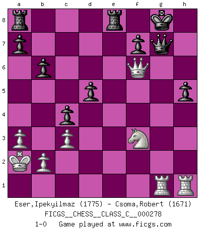 Last move : 1-0 2020 April 16 7:57:20 [Event "FICGS__CHESS__CLASS_C__000278"] [Site "FICGS"] [Date "2020.02.10"] [Round "1"] [White "Eser,Ipekyilmaz"] [Black "Csoma,Robert"] [Result "1-0"] [WhiteElo "1775"] [BlackElo "1671"] 1.a3 c5 2.g3 d5 3.Bg2 e5 4.d3 Nf6 5.Bg5 Be7 6.Bxf6 Bxf6 7.h3 O-O 8.h4 Nc6 9.h5 h6 10.Kd2 e4 11.Kc1 exd3 12.exd3 Qb6 13.c3 Be6 14.Nd2 Rfd8 15.Nh3 Bf5 16.Nf4 Ne7 17.Re1 Bxd3 18.Nxd3 c4 19.Ne5 Qxf2 20.Ng4 Qxg2 21.Nxf6+ gxf6 22.Rxe7 Qxg3 23.Re1 Kf8 24.Nf3 Qf4+ 25.Kb1 Qf5+ 26.Ka2 Qxh5 27.Rh1 Qg6 28.Qd2 h5 29.Rag1 Qh7 30.Qf4 Qh8 31.Qc7 b6 32.Re1 Re8 33.Qd6+ Kg8 34.Reg1+ Qg7 35.Qxf6 1-0 Anderssen's Opening Kingside Castling by player Black (move 7) Player White won this chess game. Follow this game move after move (download)Chess is ruthless: you've got to be prepared to kill people. (Nigel Short) Es genügt nicht ein guter Spieler zu sein, man muß auch gut spielen. (Siegbert Tarrasch) La mitad de las variaciones que son calculadas en una partida de torneo, resultan ser completamente superfluas. Desafortunadamente, nadie sabe por adelantado cual mitad. (Jan Tinman) Echiquier : carré parfait, comme la Jérusalem nouvelle décrite par l'auteur de l'Apocalypse, huit cases sur huit, exaltation du chiffre 4, symbole du cosmos aux quatre horizons... où le noir et le blanc, l'ombre et la lumière, le mal et le bien s'entremêlent et se conjuguent. (Robert Couffignal, Le Gambit du poète) All the biggest technological inventions created by man - the airplane, the automobile, the computer - says little about his intelligence, but speaks volumes about his laziness. (Mark Kennedy)