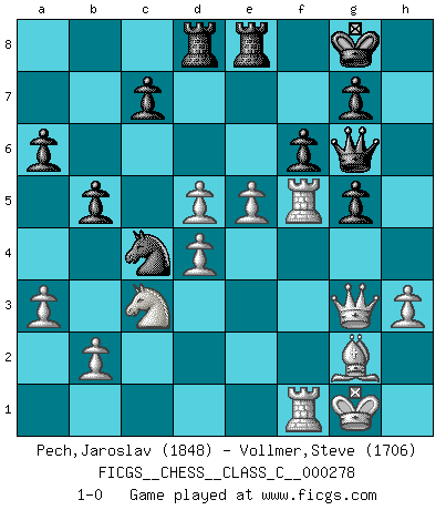 Last move : 1-0 2020 August 30 14:1:44 [Event "FICGS__CHESS__CLASS_C__000278"] [Site "FICGS"] [Date "2020.02.10"] [Round "1"] [White "Pech,Jaroslav"] [Black "Vollmer,Steve"] [Result "1-0"] [WhiteElo "1848"] [BlackElo "1706"] 1.c4 e5 2.Nc3 Nf6 3.Nf3 b6 4.Nxe5 d5 5.Qa4+ Bd7 6.Nxd7 Nbxd7 7.cxd5 Bd6 8.d4 O-O 9.g3 Re8 10.Bg2 a6 11.a3 b5 12.Qc2 Ng4 13.O-O Qf6 14.Qd1 Qg6 15.e4 Nb6 16.h3 Nxf2 17.Rxf2 Bxg3 18.Rf5 h6 19.Qf3 Rad8 20.Bg5 hxg5 21.Qxg3 f6 22.Raf1 Nc4 23.e5 1-0 English Opening Kingside Castling by player Black (move 8) Kingside Castling by player White (move 13) Player White won this chess game. Follow this game move after move (download)Not only will I predict his triumph over Botvinnik, but I'll go further and say that he'll probably be the greatest Chess player that ever lived. (John Collins) Vom Schach wurde gesagt das Leben sei dafür nicht lange genug. Aber das ist der Fehler des Lebens, nicht des Schach'. (Irving Chernev) Nunca nadie ha ganado una partida de Ajedrez rindiendose. (Unknown) La solitude du joueur d'Echecs à l'approche du mat est semblable à celle du condamné. (Francis Szpiner) Now the reason the enlightened prince and the wise general conquer the enemy whenever they move and their achievements surpass those of ordinary men is foreknowledge. (Sun Tzu)