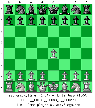 Last move : 1-0 2020 March 21 21:37:22 [Event "FICGS__CHESS__CLASS_C__000278"] [Site "FICGS"] [Date "2020.02.10"] [Round "1"] [White "Zaunercik,Ilmar"] [Black "Horta,Jose"] [Result "1-0"] [WhiteElo "1764"] [BlackElo "1600"] 1.e4 1-0 This chess game has been lost on time (started : 2020.02.10 9:8:32) King's pawn Opening Player White won this chess game. Follow this game move after move (download)Examine moves that smite! A good eye for smites is far more important than a knowledge of strategical principles. (Purdy) Ja, ich habe einmal eine Blitzpartie gespielt, es war in einem Zug, 1929. --im Interview 1989 (Mikhail Moiseyevich Botvinik) Una compensación adecuada por un sacrificio es tener una combinación sólida que conduce a una posición ganadora; una compensación adecuada por una metida de pata es dejar a tu oponente arrebatar una derrota de las fauces de la victoria. (Bruce A. Moon) J'ai toujours senti une vague pitié pour l'homme qui ne connaît rien aux échecs, tout comme j'en aurais pour un homme ignorant de l'amour. Les Echecs, comme la musique ou comme l'amour, ont le pouvoir de rendre heureux. (Siegbert Tarrasch) Live, lose, and learn, by observing your opponent how to win. (Amber Steenbock)