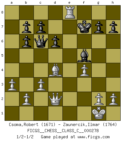 Last move : 1/2-1/2 2020 March 10 9:27:6 [Event "FICGS__CHESS__CLASS_C__000278"] [Site "FICGS"] [Date "2020.02.10"] [Round "1"] [White "Csoma,Robert"] [Black "Zaunercik,Ilmar"] [Result "1/2-1/2"] [WhiteElo "1671"] [BlackElo "1764"] 1.e4 e5 2.Nf3 Nc6 3.d4 exd4 4.Nxd4 Bc5 5.Nb3 Bb6 6.Bd3 Ne5 7.O-O Nxd3 8.Qxd3 d6 9.Nc3 Ne7 10.Na4 O-O 11.Nxb6 axb6 12.Be3 Nc6 13.f4 f5 14.exf5 Bxf5 15.Qd2 Qd7 16.Nd4 Nxd4 17.Bxd4 Qc6 18.c3 Rfe8 19.a3 Bg4 20.Rae1 Bf5 21.Rxe8+ Rxe8 22.Re1 Kf7 23.Rxe8 1/2-1/2 Scotch : Potter variation Kingside Castling by player White (move 7) Kingside Castling by player Black (move 10) This chess game ended in a draw. Follow this game move after move (download)Your body has to be in top condition. Your Chess deteriorates as your body does. You can't separate body from mind. (Bobby Fischer) Mit Schach schule ich mein Gefühl für Geometrie, was für Tennis und Schach gleichermaßen wichtig ist. (Boris Becker) En posiciones complicadas, Bobby Fischer pocas veces tuvo que temer de cualquiera. (Paul Keres) Toutes choses étant égales, c'est la conviction qui gagne. Alliée à une volonté de vaincre, elle sert de détonateur, suscite des idées, disperse les doutes et aide à penser clairement. (Robert Fischer) Perseverance does not equal worthiness. Next time you want to get my attention, wear something fun. Low-riding jeans are hot. (Gregory House, House M.D.)