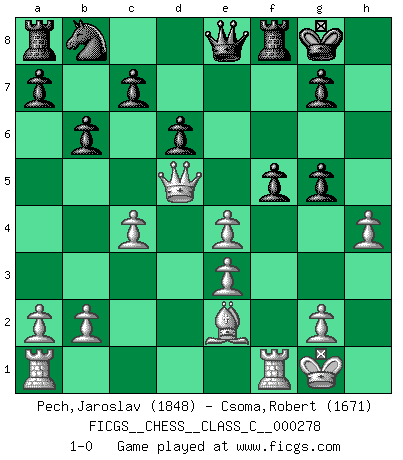 Last move : 1-0 2020 June 20 11:16:27 [Event "FICGS__CHESS__CLASS_C__000278"] [Site "FICGS"] [Date "2020.02.10"] [Round "1"] [White "Pech,Jaroslav"] [Black "Csoma,Robert"] [Result "1-0"] [WhiteElo "1848"] [BlackElo "1671"] 1.d4 f5 2.c4 Nf6 3.Nc3 e6 4.Nf3 Be7 5.Bf4 O-O 6.e3 b6 7.Be2 Bb7 8.O-O Ne4 9.Nxe4 Bxe4 10.h4 d6 11.Ng5 Bxg5 12.Bxg5 Qe8 13.d5 exd5 14.f3 h6 15.fxe4 hxg5 16.Qxd5+ 1-0 Dutch with c4 & Nc3 Kingside Castling by player Black (move 5) Kingside Castling by player White (move 8) Player White won this chess game. Follow this game move after move (download)The game of Chess is not merely an idle amusement; several very valuable qualities of the mind are to be acquired and strengthened by it, so as to become habits ready on all occasions; for life is a kind of Chess. (Benjamin Franklin) Besser ein falscher Plan, logisch durchgeführt, als gar kein Plan. (Viktor Kortschnoi) Tu no necesitas jugar muy bien, únicamente ayudar a tu oponenet a que juegue muy mal. (Genrikh Chepukaitis) Je ne crois pas en la psychologie, je crois aux bons coups. (Robert Fischer) Any activity becomes creative when the doer cares about doing it right or doing it better. (John Updike)