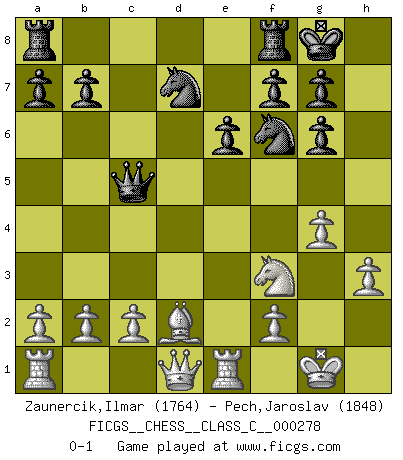 Last move : 0-1 2020 August 19 1:6:57 [Event "FICGS__CHESS__CLASS_C__000278"] [Site "FICGS"] [Date "2020.02.10"] [Round "1"] [White "Zaunercik,Ilmar"] [Black "Pech,Jaroslav"] [Result "0-1"] [WhiteElo "1764"] [BlackElo "1848"] 1.e4 d5 2.exd5 Qxd5 3.Nc3 Qa5 4.Nf3 Nf6 5.Bc4 Bg4 6.h3 Bh5 7.O-O e6 8.d4 Nbd7 9.Re1 Bd6 10.Bd2 O-O 11.Bd3 c5 12.Nb5 Qb6 13.Nxd6 Qxd6 14.g4 Bg6 15.dxc5 Qxc5 16.Bxg6 hxg6 0-1 This chess game has been lost on time (started : 2020.02.10 9:8:32) Scandinavian (centre counter) defense Kingside Castling by player White (move 7) Kingside Castling by player Black (move 10) Player Black won this chess game. Follow this game move after move (download)No price is too great for the scalp of the enemy King. (Koblentz) Ich habe Putins Aufstieg an die Macht beobachtet und seine Politik, die demokratischen Institutionen meines Landes zu zerstören. (Garry Kasparov) Los finales de Peón son del Ajedrez lo que el cesped es del Golf. (Cecil Purdy) Je menace de comprendre la position. (Anonyme) In every real man a child is hidden that wants to play. (Friedrich Nietzsche)