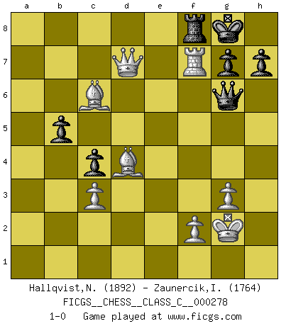 Last move : 1-0 2020 March 6 16:50:42 [Event "FICGS__CHESS__CLASS_C__000278"] [Site "FICGS"] [Date "2020.02.10"] [Round "1"] [White "Hallqvist,Niklas"] [Black "Zaunercik,Ilmar"] [Result "1-0"] [WhiteElo "1892"] [BlackElo "1764"] 1.c4 c5 2.g3 Nf6 3.Bg2 d5 4.cxd5 Nxd5 5.Nc3 Nxc3 6.bxc3 e6 7.Rb1 Nd7 8.Nf3 Be7 9.O-O O-O 10.d4 Qa5 11.Qb3 Qa6 12.Qc2 c4 13.a4 Nb6 14.Ra1 Bd7 15.a5 Nd5 16.e4 Nf6 17.Bf4 Bc6 18.Nd2 Nh5 19.Be3 f5 20.d5 exd5 21.exd5 Bd7 22.Rfe1 Bd6 23.Bf1 Rac8 24.Bd4 f4 25.Ne4 fxg3 26.hxg3 Bf5 27.Qd1 Rce8 28.Qxh5 Bxe4 29.Qg4 Bg6 30.Qd7 Bf7 31.Bh3 Rxe1+ 32.Rxe1 Qxa5 33.Qxd6 Qxd5 34.Qa3 Qh5 35.Bg2 Qg5 36.Qxa7 b5 37.Bc6 Qd2 38.Re7 Qd1+ 39.Kg2 Qh5 40.Qd7 Qg6 41.Rxf7 1-0 English : Symmetrical variation Kingside Castling by player White (move 9) Kingside Castling by player Black (move 9) Player White won this chess game. Follow this game move after move (download)What is the difference between chess and football? Everybody understands football, but nobody plays it. Everybody plays chess, but nobody understands it. Everything is relative. (Vladimir Kramnik) Ich habe die Schachforschung dermaßen betrieben, dass sie auf eine wissenschaftliche Basis gestellt wurde. (Mikhail Moiseyevich Botvinik) Desconfianza es la característica mas necesaria de un jugador de Ajedrez. (Siegbert Tarrasch) La menace est plus forte que l'exécution. (Aaron Nimzovitch) An expert is a man who has made all the mistakes which can be made in a very narrow field. (Niels Bohr)