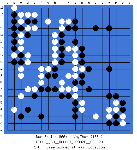 Last move : 1-0 2020 February 10 19:25:47 [Event "FICGS__GO__BULLET_BRONZE__000229"] [Site "FICGS"] [Date "2020.02.10"] [Round "1"] [Black "Dao,Paul"] [White "Vo,Tham"] [Result "1-0"] [Rating 1 "1866"] [Rating 2 "1634"] 1.q16 q4 2.d4 d16 3.r6 r5 4.q6 o3 5.q10 c6 6.f3 b4 7.c3 c9 8.k16 g17 9.o16 k17 10.l17 j17 11.l16 j16 12.j15 h15 13.j14 h14 14.j13 h13 15.j12 h12 16.j11 h11 17.c16 c15 18.b15 c17 19.b16 c14 20.b14 c13 21.b13 b12 22.b17 c18 23.b18 b19 24.d17 d18 25.e17 e18 26.d15 e16 27.c12 d12 28.c11 d11 29.b11 c10 30.h10 g10 31.g9 f10 32.h9 f9 33.g7 f8 34.f7 e7 35.e6 d7 36.l3 m4 37.l4 m5 38.l5 l6 39.k6 l7 40.n7 k7 41.j6 k9 42.m9 j7 43.h7 j8 44.l8 l9 45.m8 l10 46.m11 m10 47.n10 l11 48.m12 l12 49.m13 l13 50.l14 k13 51.r3 q3 52.s5 r4 53.s4 s3 54.r2 s2 55.q2 1-0 Here are the names of the openings (joseki) played in the four corners : Corner q4 : q4 r6 Hoshi (Hwajeom, Seongjeom, Xingwei`) 4-4 Point. The star or hoshi (4-4) point, emphasizing influence at the potential expense of territory. Ikken Kakari (Hankan Keolch'im, Yi Gua`jiao~, 1-Space Low Approach). Black 2 is the standard approach move to the 4-4. Corner d4 : d4 c6 Hoshi (Hwajeom, Seongjeom, Xingwei`) 4-4 Point. The star or hoshi (4-4) point, emphasizing influence at the potential expense of territory. Ikken Kakari (Hankan Keolch'im, Yi Gua`jiao~, 1-Space Low Approach). White 2 is the standard approach move to the 4-4. Player Black won this Go (weiqi, baduk) game. Follow this game move after move (download)Win the stones, lose the game. (Anonymous) When you don't know what to do, walk fast and look worried. (Anonymous)